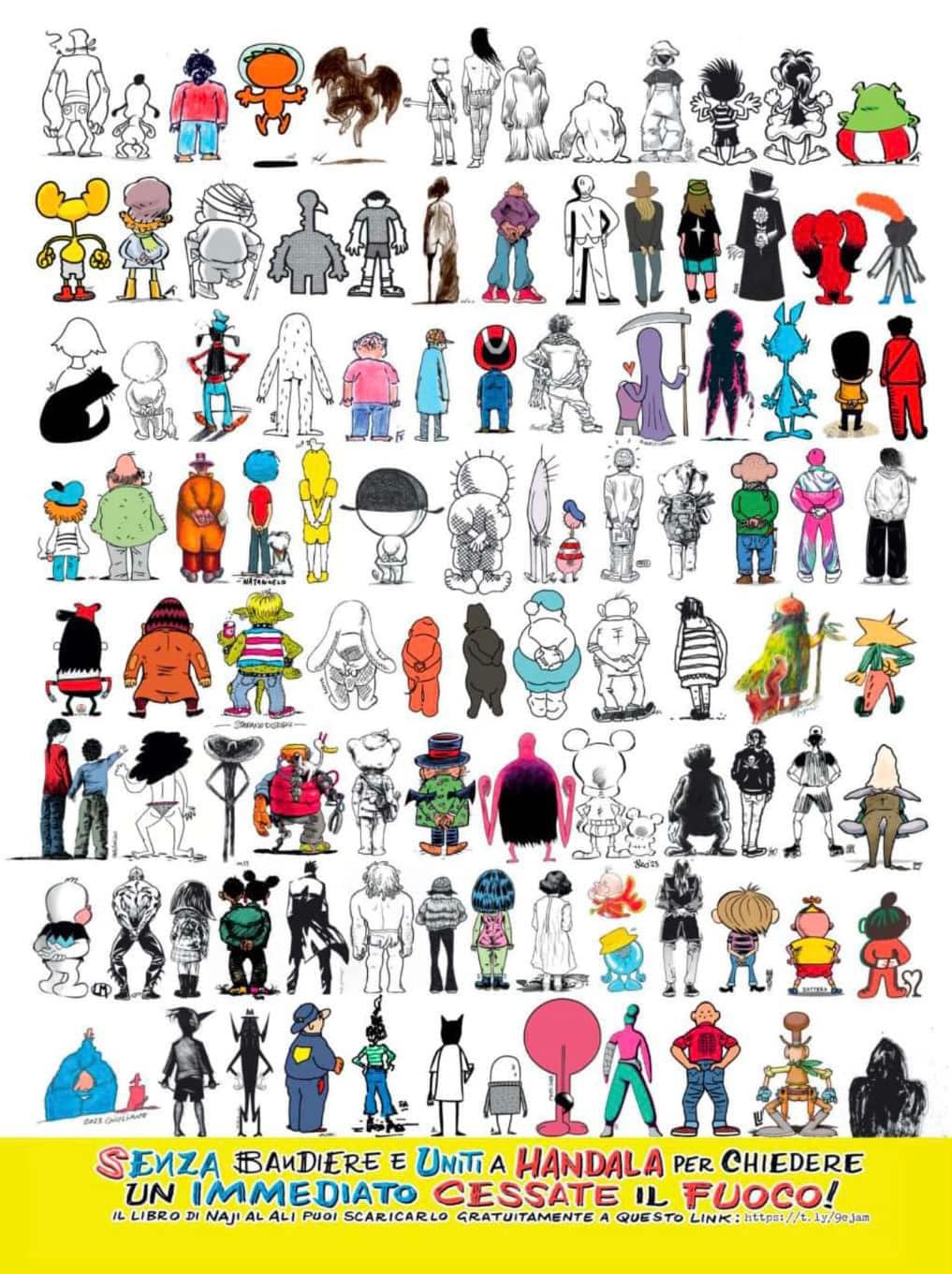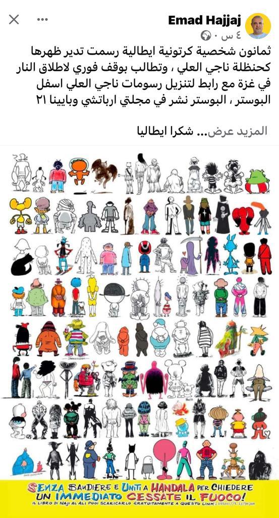 عمون - نشرت مجلتا ارباتشي وبايينا 21، "بوستر" لـ80 شخصية كرتونية إيطالية تدير ظهرها كحنظلة ناجي العلي؛ للمطالبة بوقف فوري لإطلاق النار في غزة. |