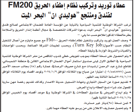 مطلوب تركيب نظام أطفاء الحريق لفندق "هوليدي ان" البحر الميت