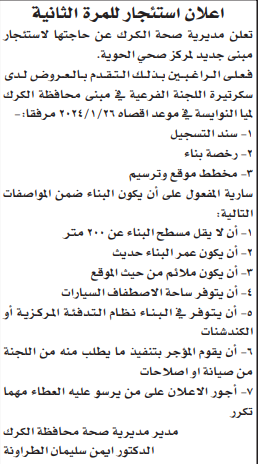 مطلوب أستئجار مبنى لمركز صحي الحوية/ الكرك