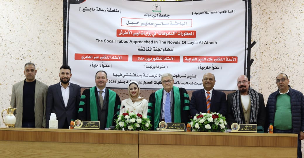 عمون - نوقشت رسالة الباحثة سالي سمير خليل الموسومة بـ: المحظورات "التابوهات" في روايات ليلى الأطرش" يوم الاثنين الخامس عشر من شهر يناير لعام 2024م في جامعة اليرموك بإشراف الأستاذ الدكتور نبيل يوسف حداد شاغل كرسي عرار للدراسات الثقافية والأدبية،
