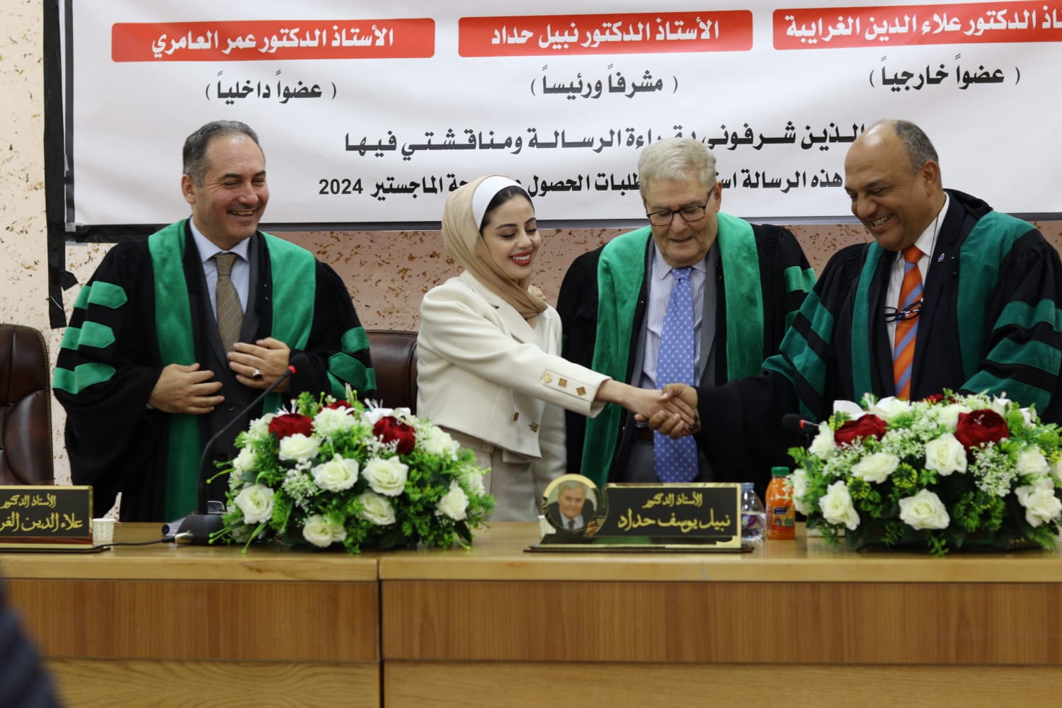 وبحضور الأستاذ الدكتور علاء الدين الغرايبة رئيس هيئة التحرير لمجلة جامعة الزيتونة للدراسات الإنسانية والاجتماعية مناقشًا وعضوًا خارجيًا، والدكتور عمر العامري مناقشًا وعضوًا داخليًا.