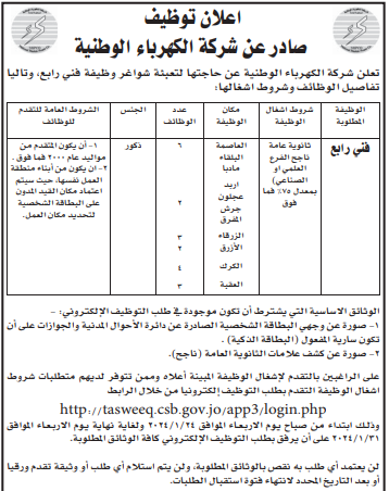 فرصة عمل لدى شركة الكهرباء الوطنية