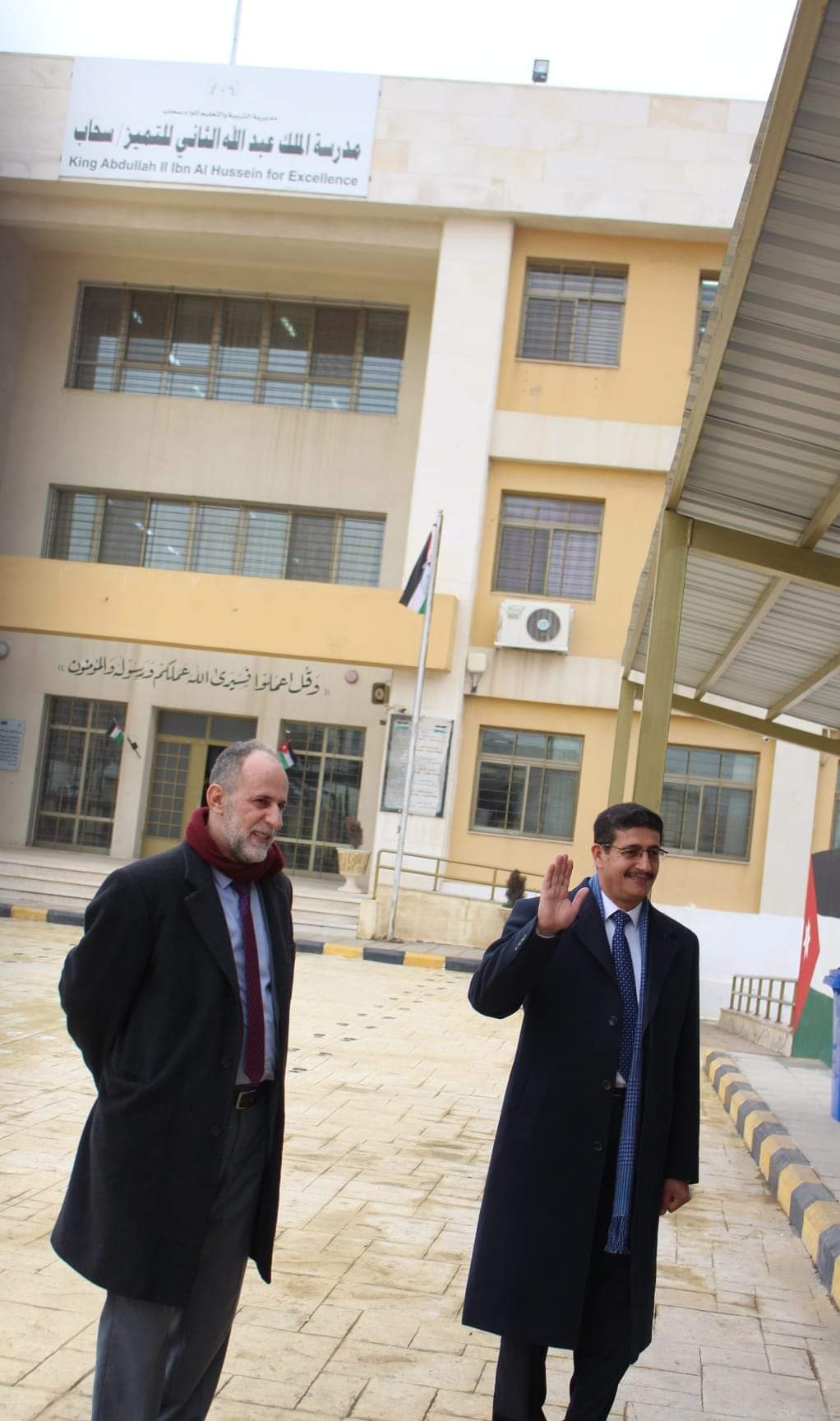 وقام المومني والهواري بزيارة مدرسة الملك عبدالله الثاني للتميز لعقد اجتماع مديري ومديرات مدارس الملك عبدالله الثاني للتميز في مدرسة الملك عبدالله الثاني للتميز - سحاب.