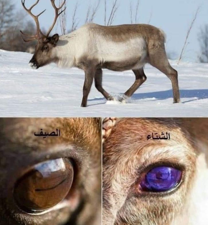 عمون - تستطيع حيوانات الرنة الرؤية ليلاً، كما أنها قادرة على تغيير لون عينيها مع تغير فصول السنة.