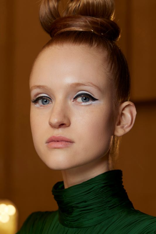ظلال العيون المسحوبة بالمقلوب أو ما يُعرف بالمكياج المعكوس هو موضة رائجة خلال هذا الموسم، كما أنها لاقت شعبية كبيرة خلال السنوات الأخيرة بين النساء. لذلك، لا تترددي في أن تتألقي بمكياج عيون أبيض معكوس، تقومين فيه بتطبيق ظلال العيون بدءاً من العين مروراً بكامل منبت الجفون السفلية، ما يضيء عينيك ويجعلهما أكثر إشراقةً واتساعاً. في المقابل، اعتمدي تغطية ناعمة للبشرة مع الحرص على إخفاء العيوب والشوائب، إلى جانب أحمر شفاه باللون النيود.