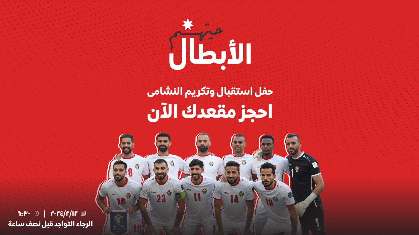 عمون - يقيم الاتحاد الأردني لكرة القدم، حفل استقبال وتكريم لمنتخب النشامى تحت عنوان "حيهم الأبطال" بعد الإنجاز التاريخي بوصول المنتخب الوطني للمباراة النهائية لبطولة كأس آسيا قطر 2023.