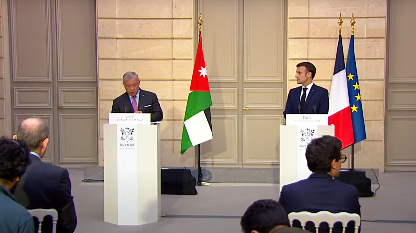 وقال جلالة الملك "نحن ممتنون لجهود فرنسا تحت قيادتكم في السعي نحو وقف إطلاق النار وزيادة المساعدات الإنسانية المتجهة إلى غزة عبر مختلف نقاط العبور والآليات المتاحة".