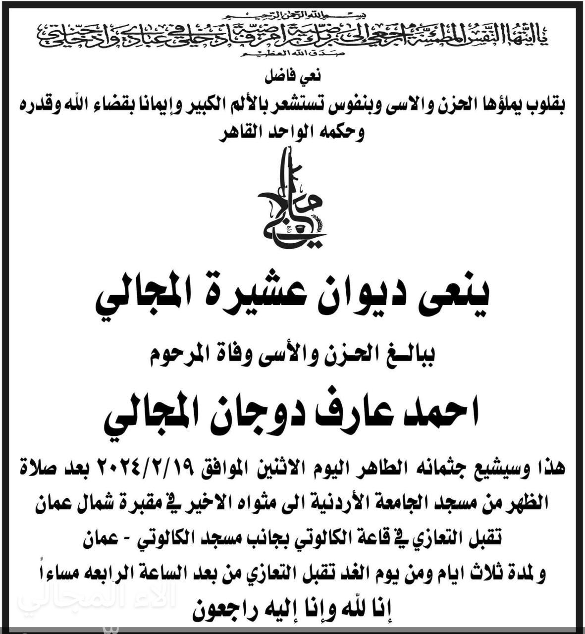 عمون - انتقل إلى رحمة الله تعالى اليوم الاثنين، والد الزميلة الإعلامية الاء المجالي