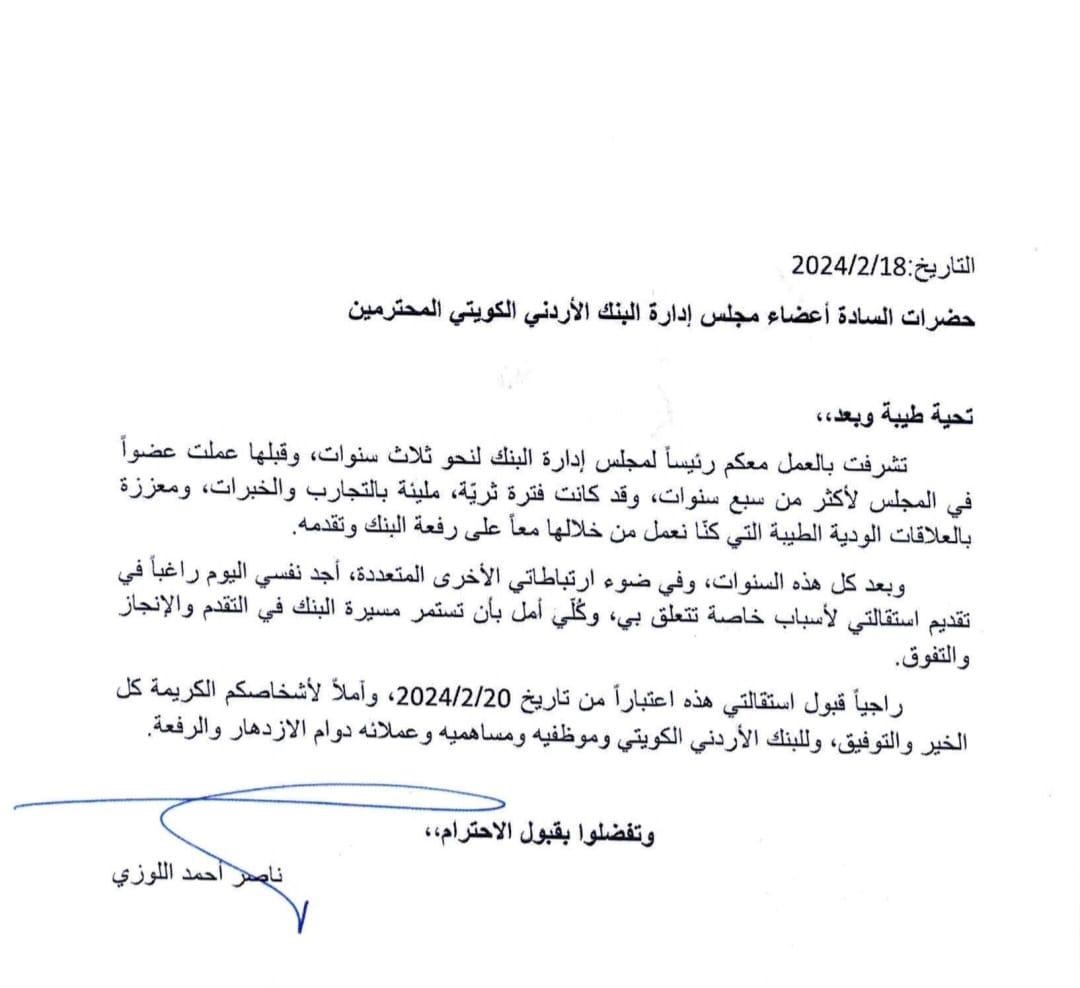 عمون - علمت عمون أن رئيس مجلس إدارة البنك الأردني الكويتي ناصر اللوزي، قدم استقالته من منصبه في البنك.