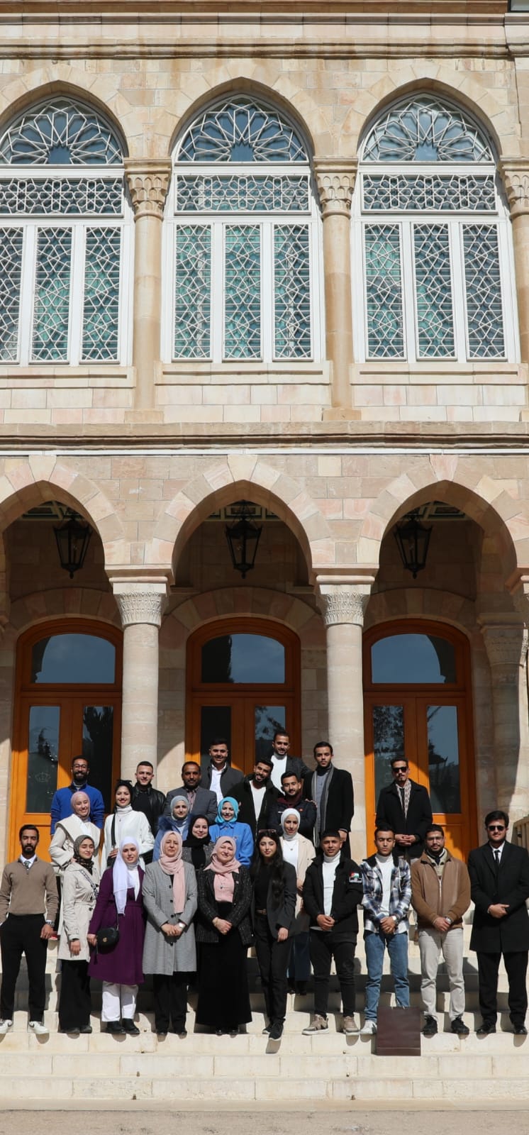 احتفالاً بمناسبة مرور 25 عاماً على جلوس جلالة الملك عبد الله الثاني ابن الحسين حفظه الله ورعاه على العرش وحصوله على اليوبيل الفضي ؛ زار وفد من الجامعة الهاشمية الديوان الملكي يضم الدكتورة يسرى الخلايلة مساعد عميد شؤون الطلبة والدكتورة حنان سعادات مدير دائرة النشاط الثقافي والفني وثلاثة وعشرون طالباً من تخصصات مختلفة في الجامعة الهاشمية؛ يحملون قلوبهم معطرة بباقة من الورد مهنئين جلالة الملك المفدى بهذه المناسبة الغالية على قلوب كل الأردنيين. هذا وتنقل الوفد بين مواقع عديدة داخل القصر الملكي؛ بدءاً من قصر رغدان العامر بيت الأردنيين الأول ، واطلع الوفد على مرافق القصر واستمع إلى شرح مفصل حول مراحل تأسيس الدولة الأردنية وأهم القاعات التي تعتبر جزءاً من تاريخ المملكة ؛ كقاعة العرش ، والقاعة الرئيسية، وفي مبنى العهدة الملكية تعرف الوفد على مقتنيات الملوك الهواشم من المؤسس عبد الله الأول إلى الملك طلال ، فالملك الحسين الباني طيب الله ثراهم جميعا ، وجال الوفد في معرض كتب وصور لمراحل وأحداث مفصلية من تاريخ الدولة الأردنية ثم صرح الراية الذي شيد في عهد صاحب الجلالة الملك عبد الله الثاني حفظه الله ورعاه ، والذي قام بتصميمه طالب من طلبة الجامعة الهاشمية تخصص الهندسة المعمارية ضمن مسابقة هندسية طرحها الديوان الملكي الهاشمي.