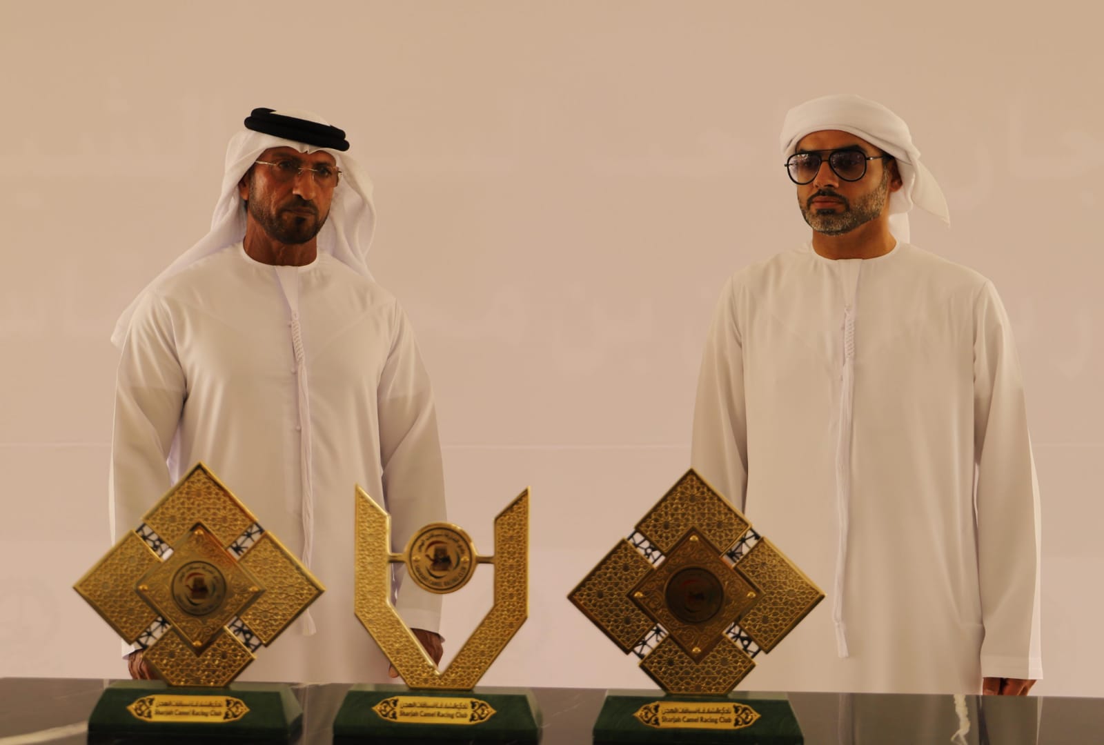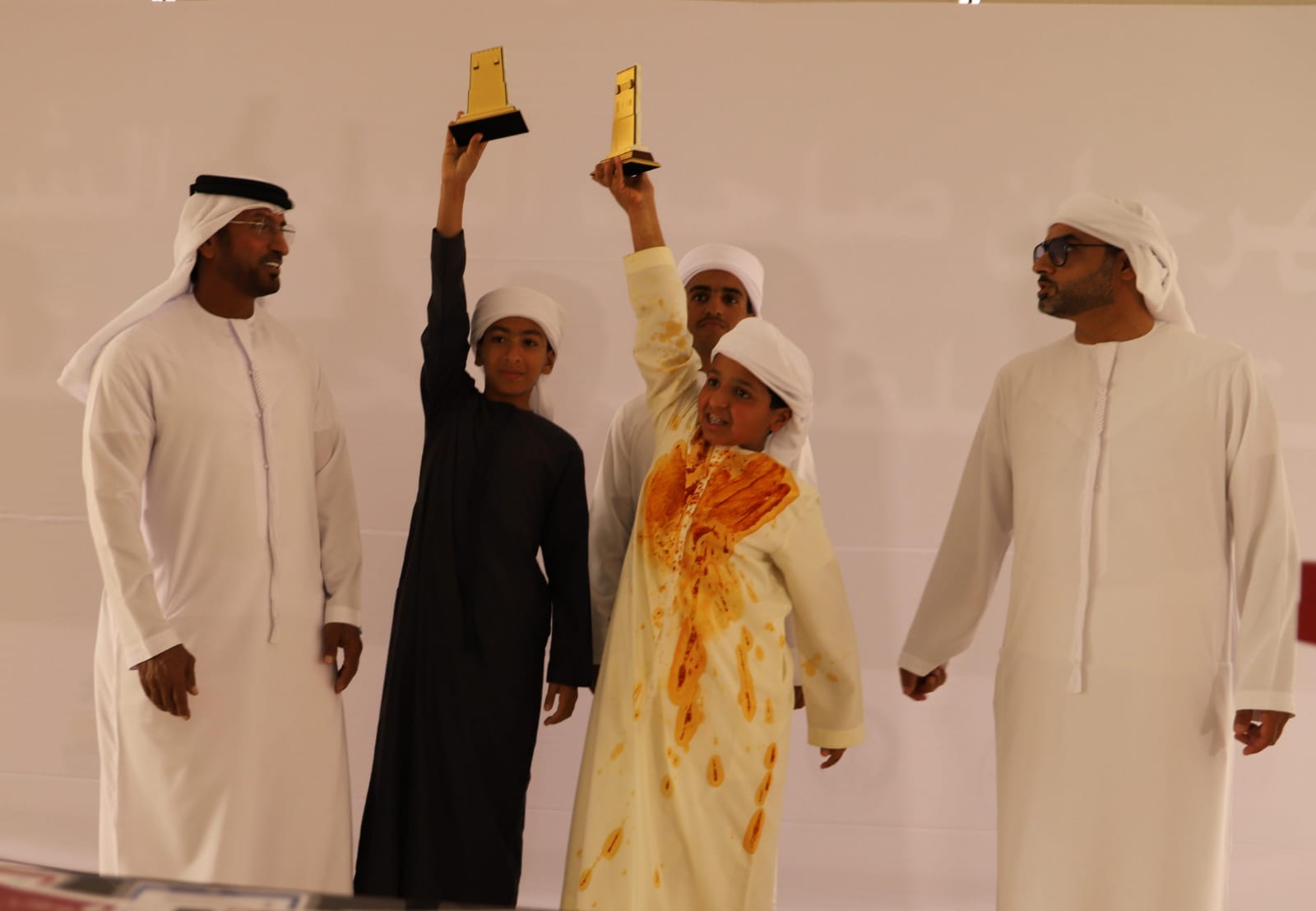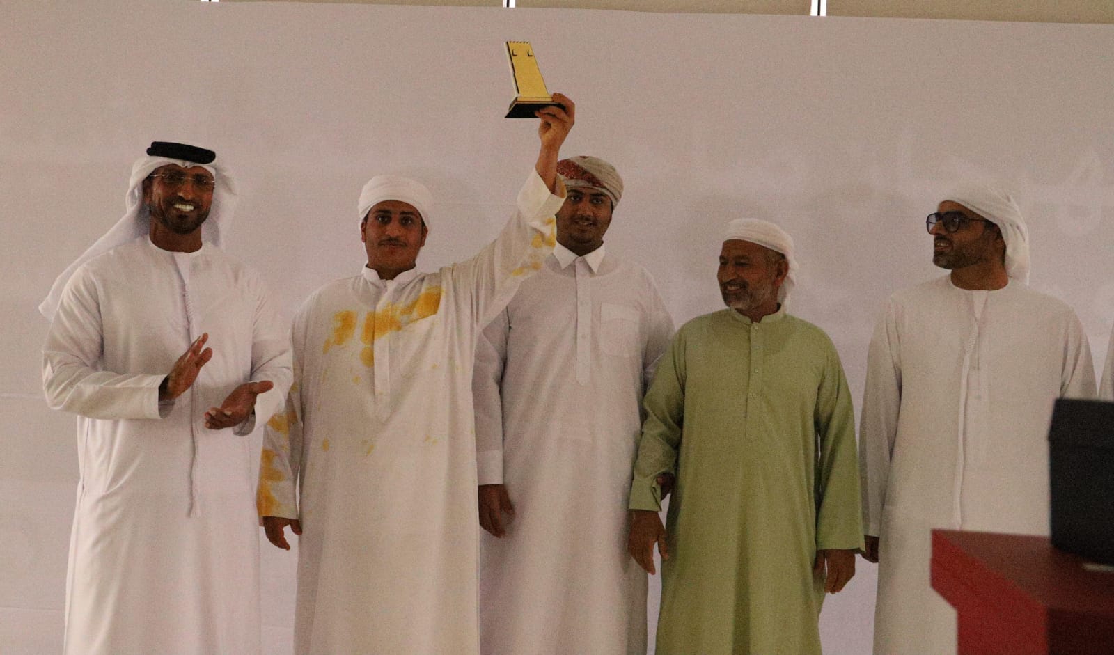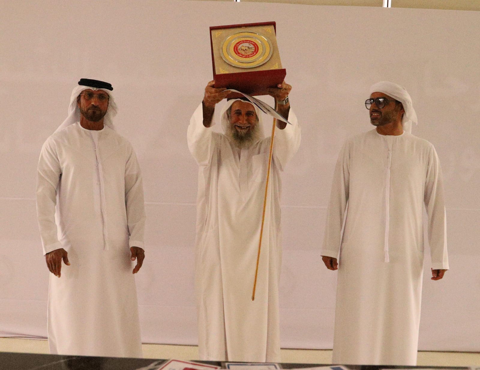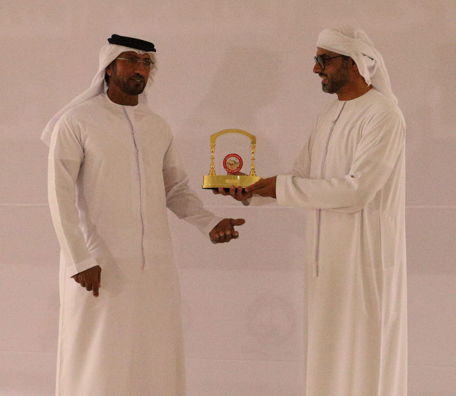 وفي نهاية السباق تويج سعادة مطر علي بن هويدن الكتبي وسيف راشد مسعود بن حامد الطنيجي مدير محمية زمول الوسطى الفائزين بأشواط الرموز.