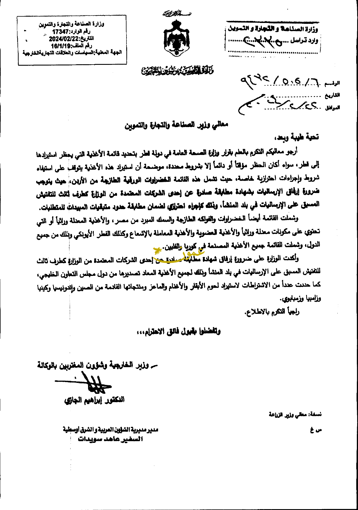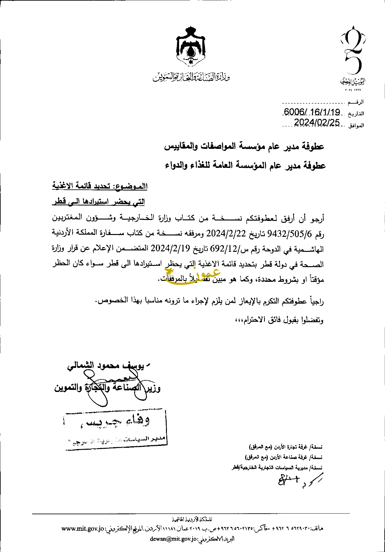 وأضاف، أن الوزارة تعمل على الإجراءات اللازمة لتسهيل الصادرات الزراعية وتجويدها، وأن متطلبات السلطات القطرية من حيث شهادات المطابقة هو إجراء يعتمده الأردن لمستورداته، ويعمل على تحقيقه للصادرات الأردنية للأسواق الأخرى مثل الأسواق الأوروبية والخليجية.