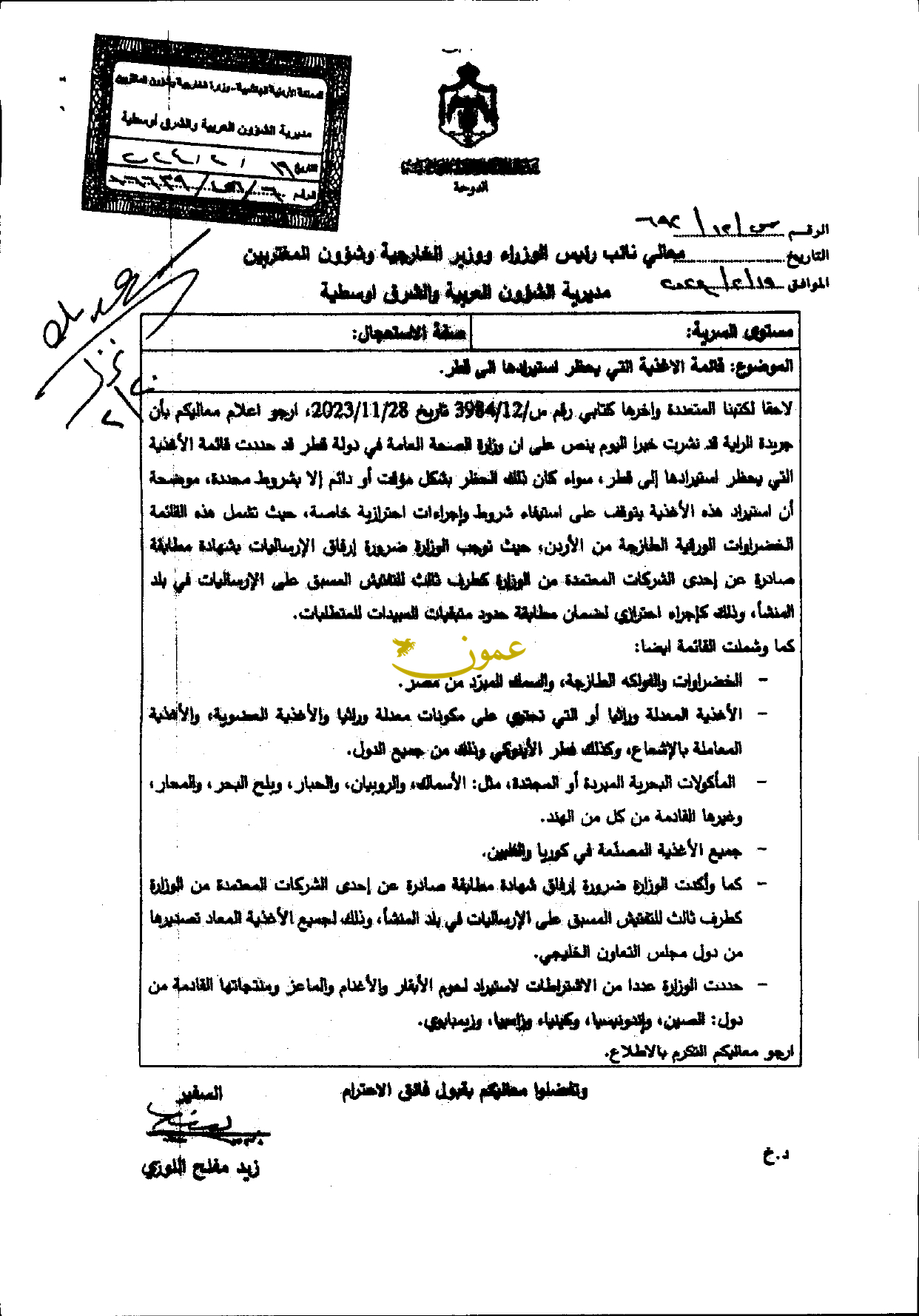 وبين أن الإجراء المتخذ من قبل الجهات القطرية، هو إجراء إحترازي يتخذ من جانبهم بشكل سنوي ويتم مراجعته من أجل الرقابة على المبيدات الزراعية مع المستوردات من المنتجات النباتية لضمان جودتها، مؤكدا تفهز وزارة الزراعة في الأردن هذا الإجراء المتخذ كون الأردن دولة تقوم بعمليات الإستيراد والتصدير وتتخذ الإجراءات المشابهة لهذا الاجراء والكفيلة بحماية صحة الإنسان.