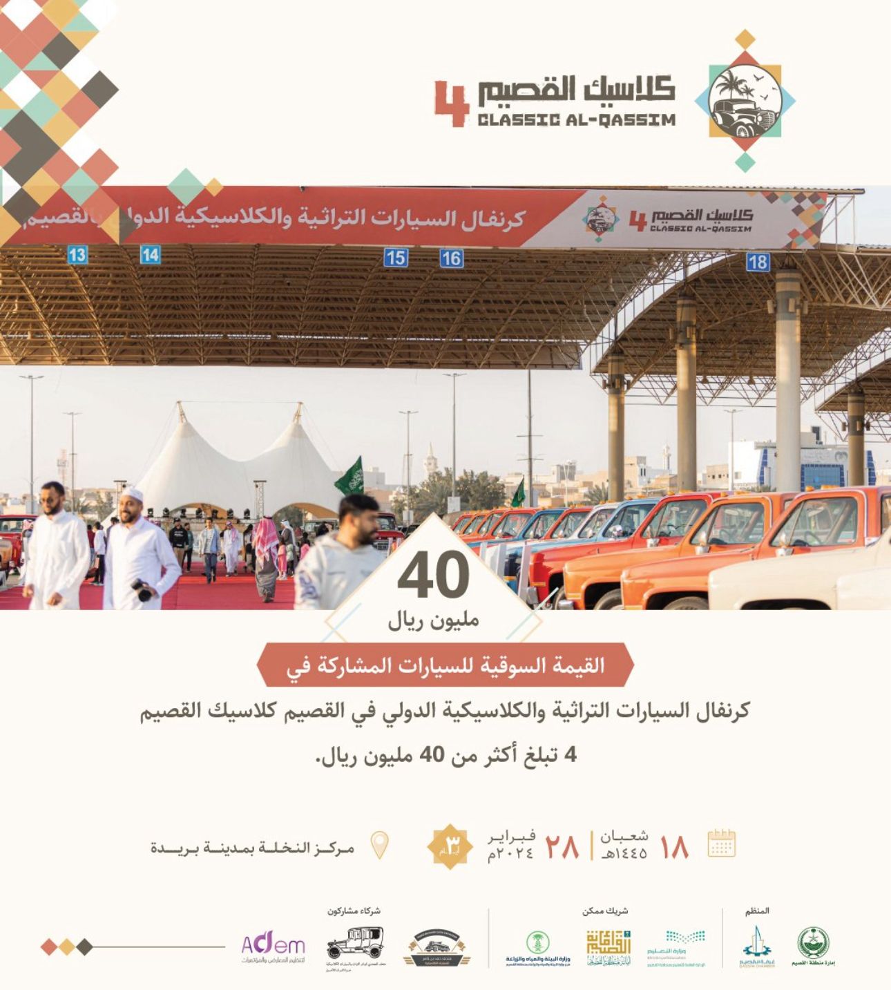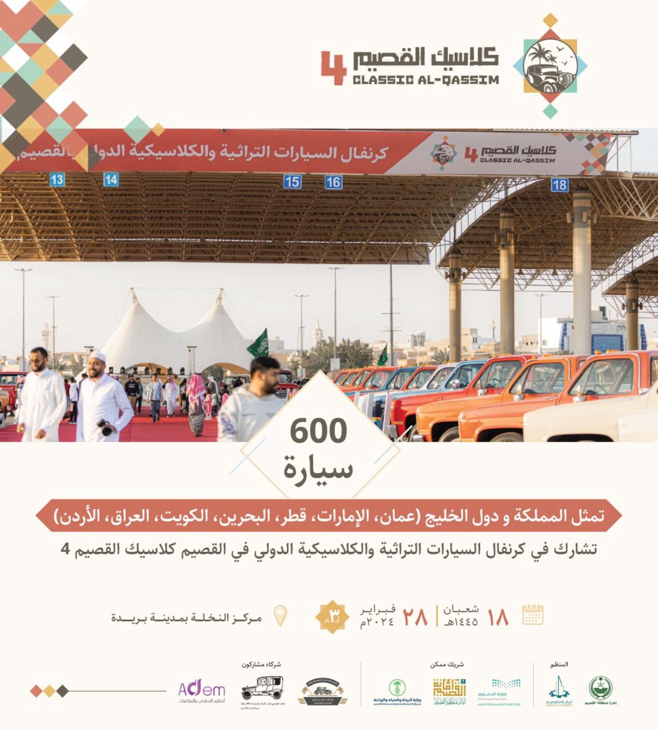 عمون - بدعوة من غرفة القصيم، شارك فريق من جمعية مالكي سيارات الأردن الكلاسيكية بكرنفال السيارات التراثية والكلاسيكية الرابع بمدينة البريدة بمحافظة القصيم بالمملكة العربية السعودية بالفترة من تاريخ 28 شباط 2024 وحتى 1 اذار 2024.