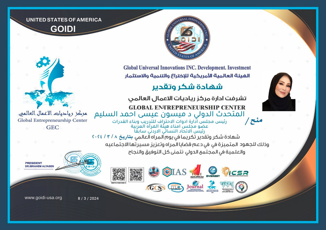 عمون - شاركت د ميسون تليلان السليّم رئيس مجلس ادارة مؤسسة ادوات الاحتراف للتدريب وبناء القدرات ومدير مركز رياديات الاعمال العالمي الامريكي - الاردن بفعاليات الملتقى الضخم في يوم المراه العالمي الذي نفذته الهيئة العالمية الامريكية للاختراع والتنمية والاستثمار والذي يقام في الثامن من اذار من كل عام مع العالم اجمع