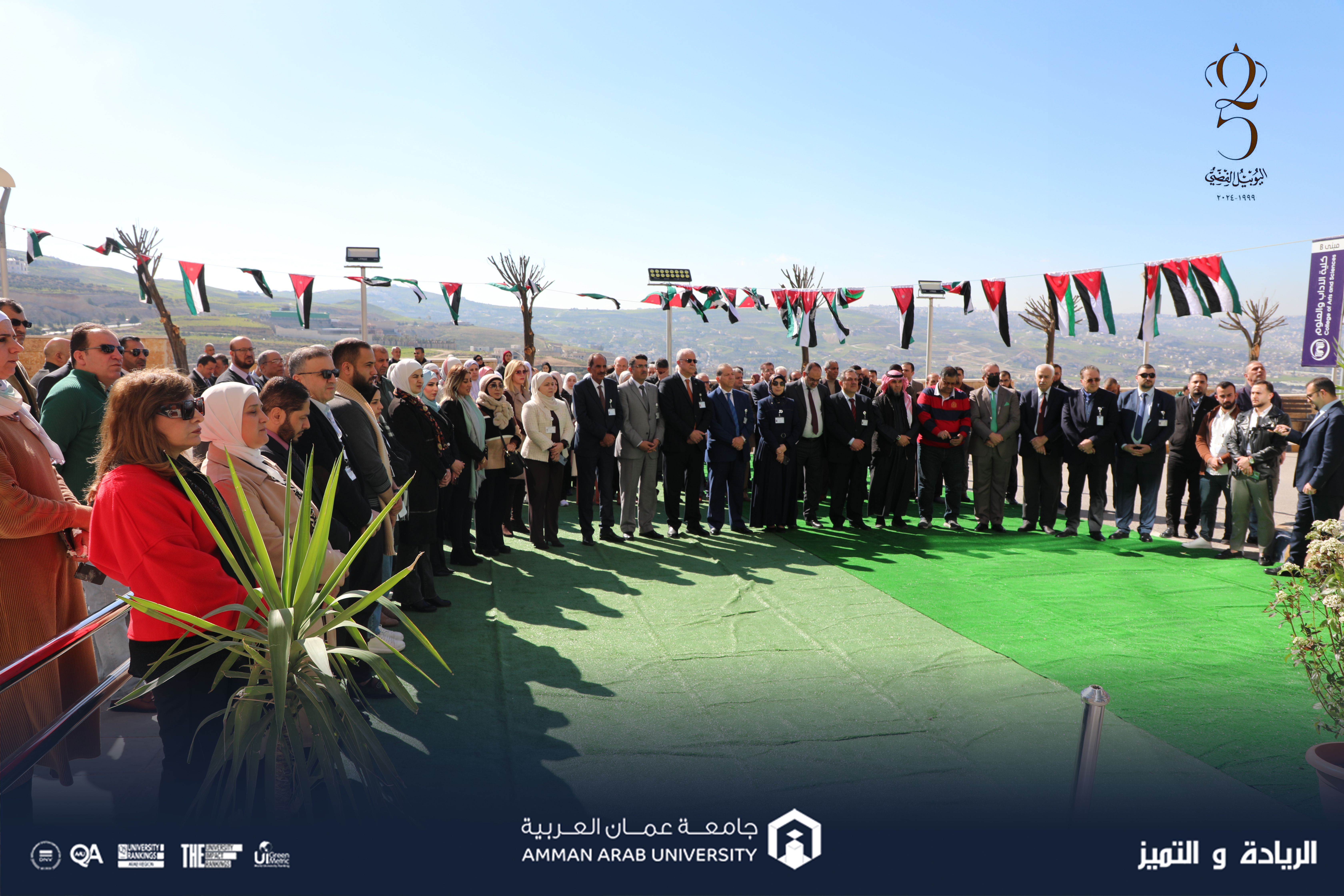 وفي نهاية الاحتفال الذي أداره مساعد عميد شؤون الطلبة الدكتور علاء البوات، تم رفع علم اليوبيل الفضي إلى جانب علم المملكة الأردنية الهاشمية خافقاً في سماء جامعة عمان العربية.