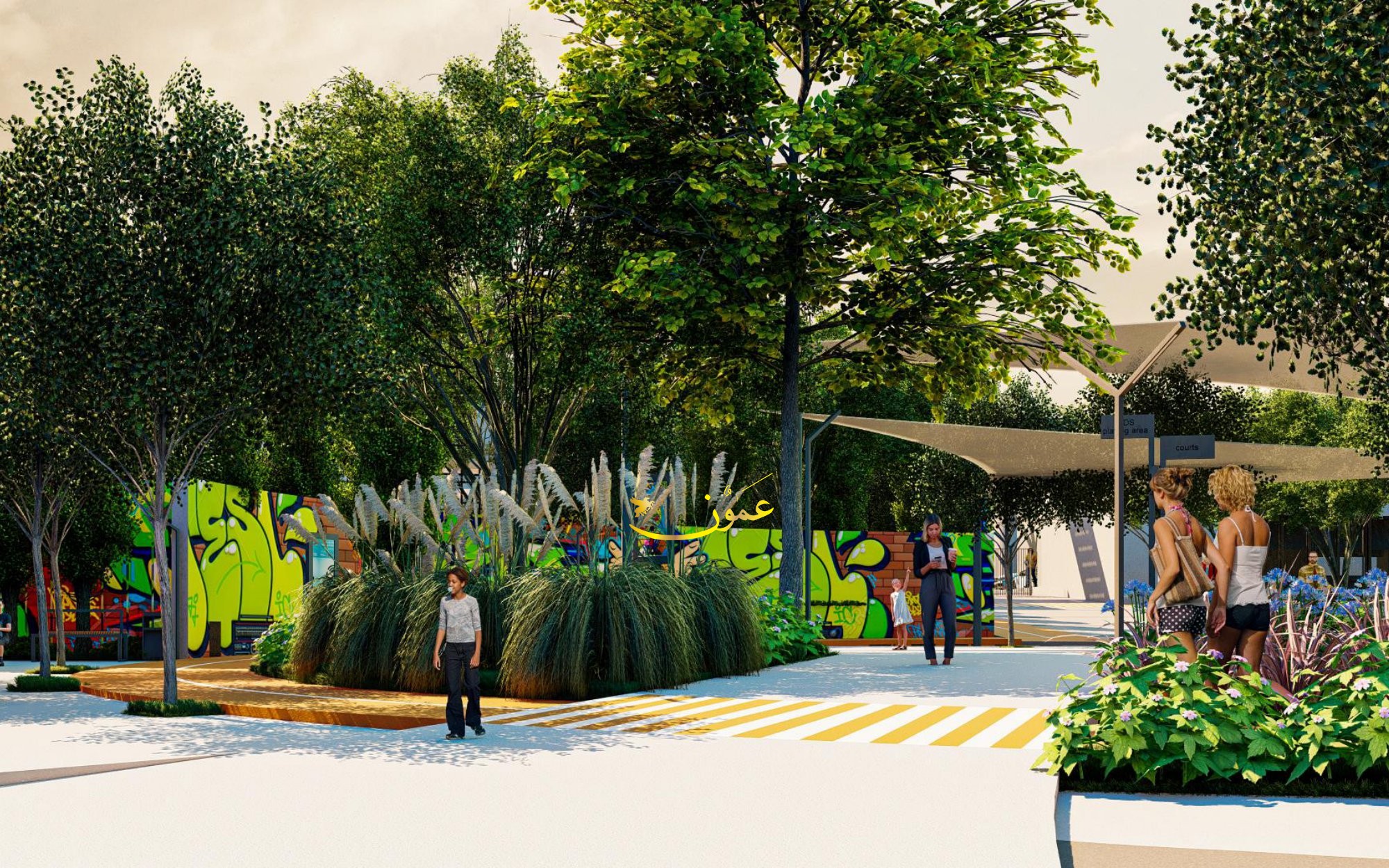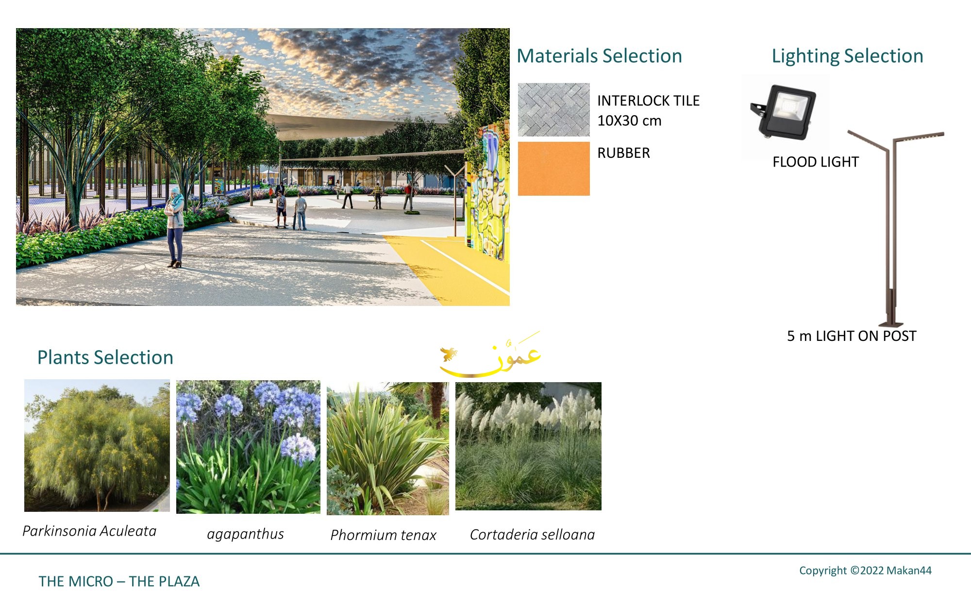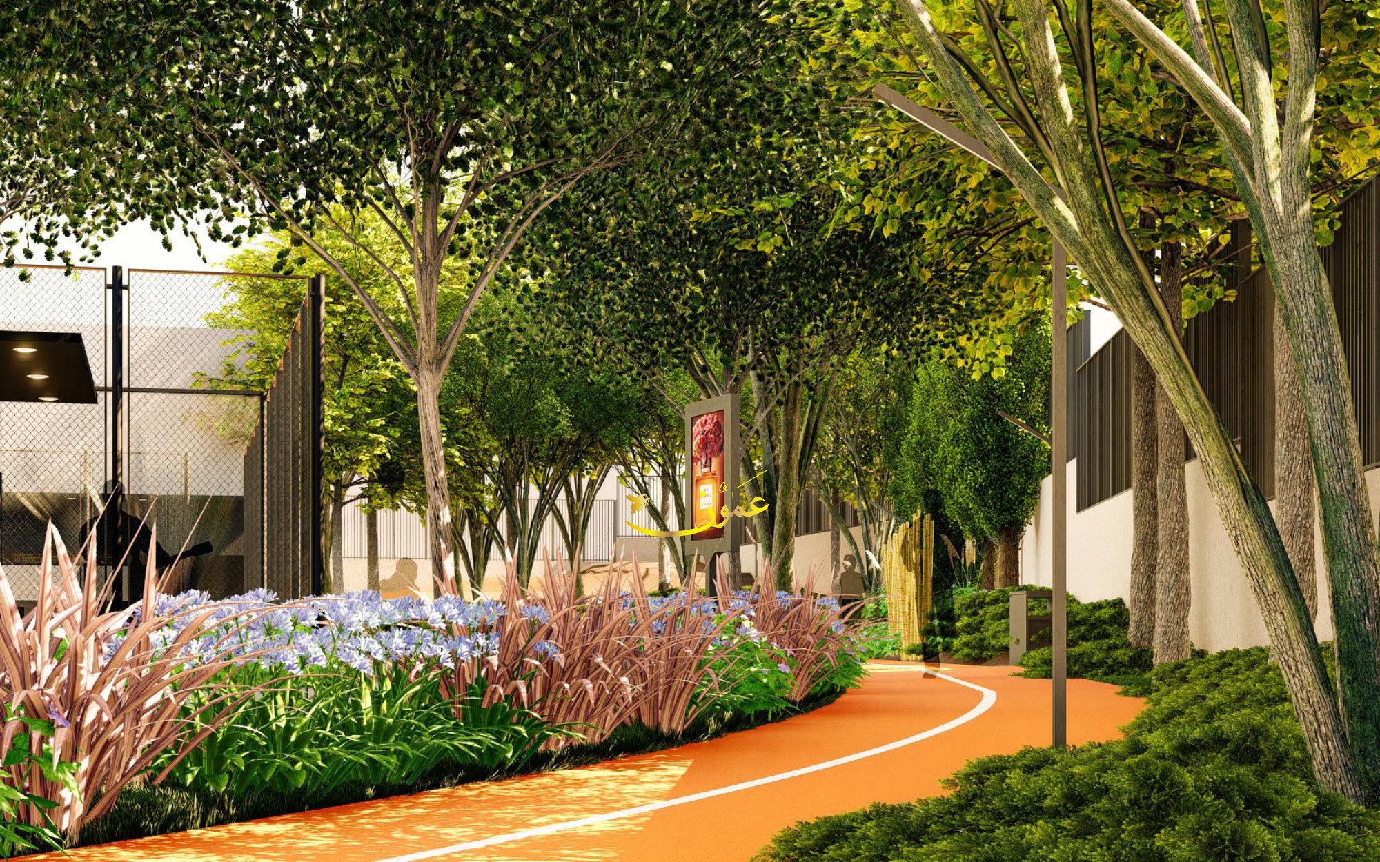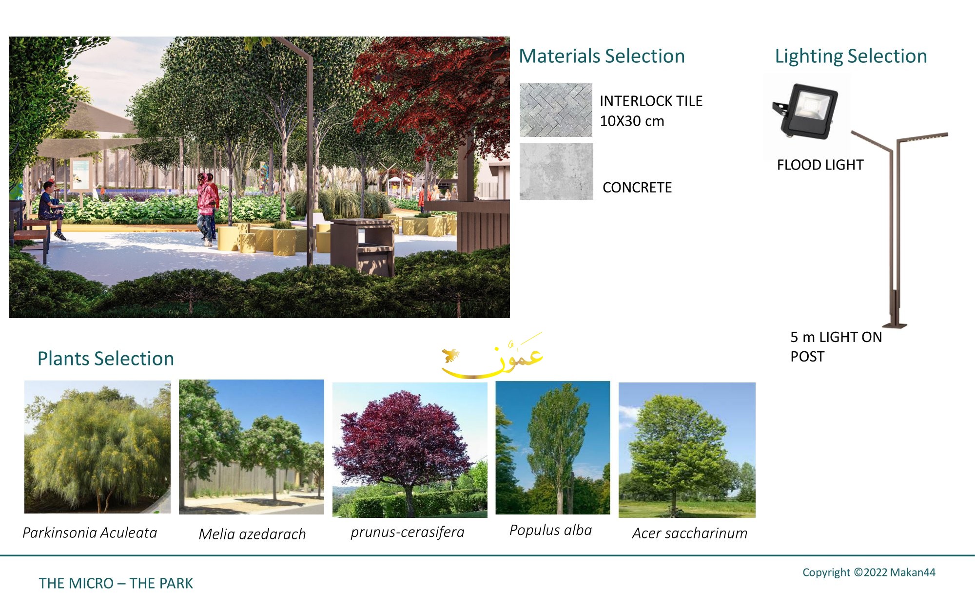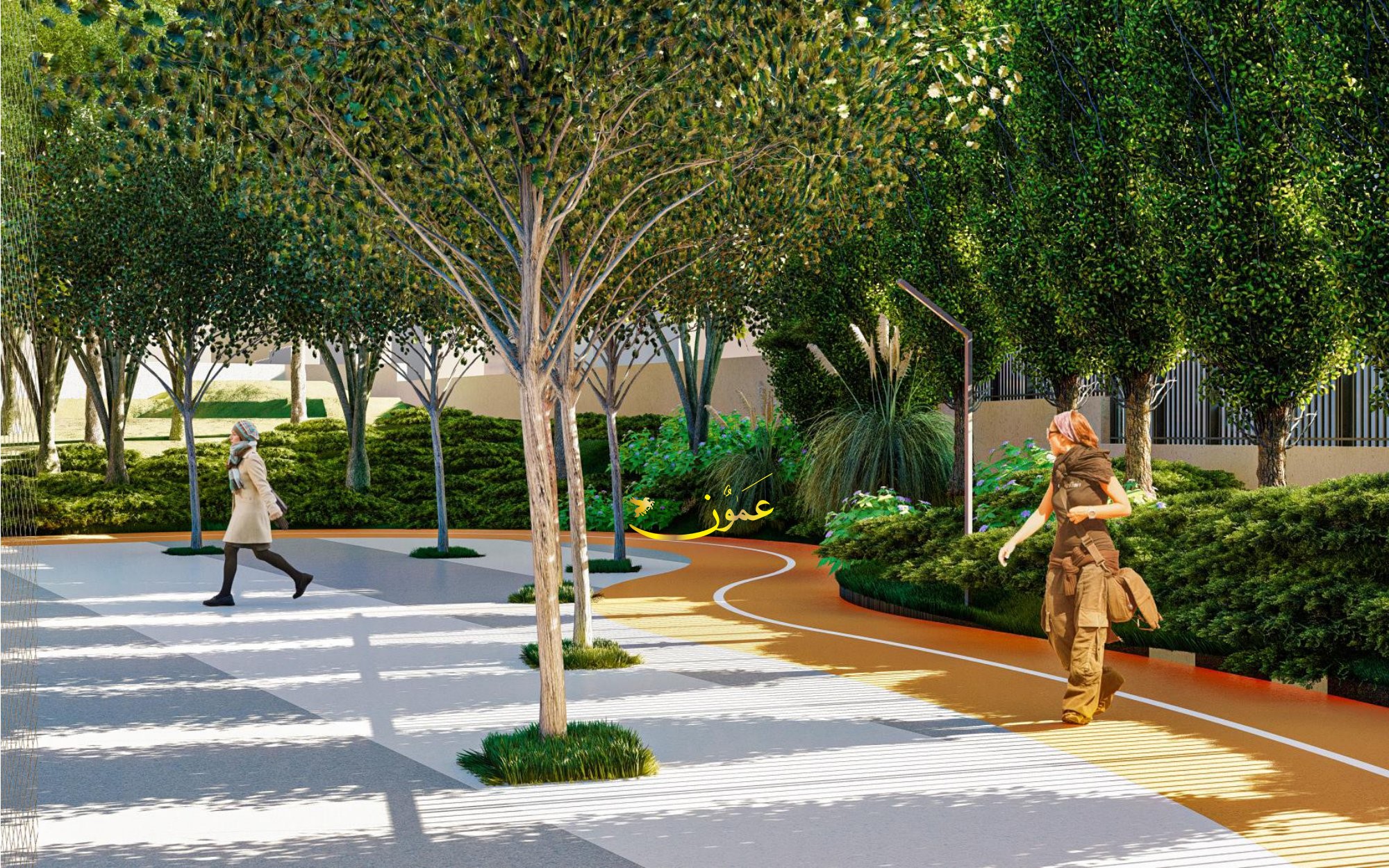 كما يتضمن زراعة أشجار حرجية دائمة الخضرة، وأشجار متساقطة الأوراق، وشجيرات ومدادات ارضية، وبصيلات وأزهار حولية، وتركيب أعمدة إنارة، إضافة إلى نظام للترقيم والتسمية، ومقاعد للجلوس والانتظار، سلال مهملات، ومظلات ومعرشات، عمون.