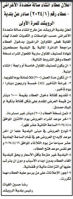 انشاء صالة متعددة الأغراض لبلدية الرويشد الجديدة