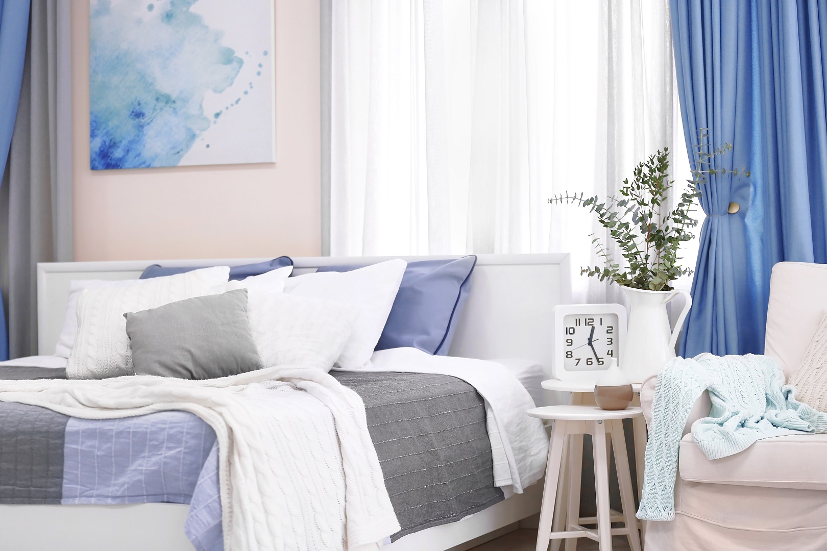 تُعزّز الستائر الكتان جمالية غرفة النوم ذات الديكور المعاصر (أو الريفي أو الساحلي)، مع نشر أشعة الشمس وتوفير الخصوصية. كما تسهل العناية بالستائر الكتان وصيانتها، إذ يمكن غسلها في الغسالة أو تنظيفها بطريقة التنظيف الجاف.