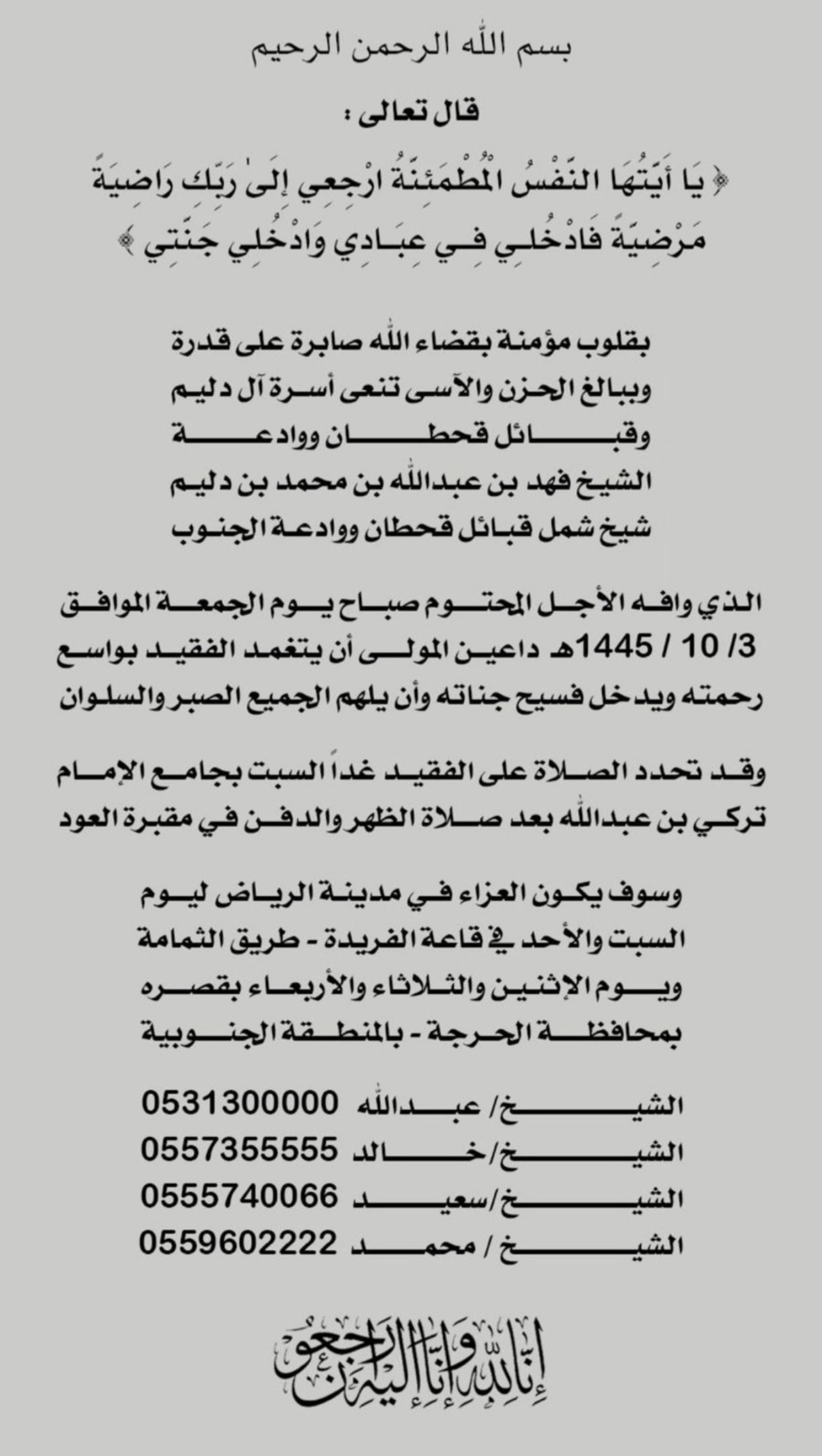 عمون - توفي الشيخ فهد بن عبدالله بن دليم، شيخ شمل قبائل قحطان ووادعة في المملكة العربية السعودية، أمس الجمعة، بعد صراع مع المرض.
