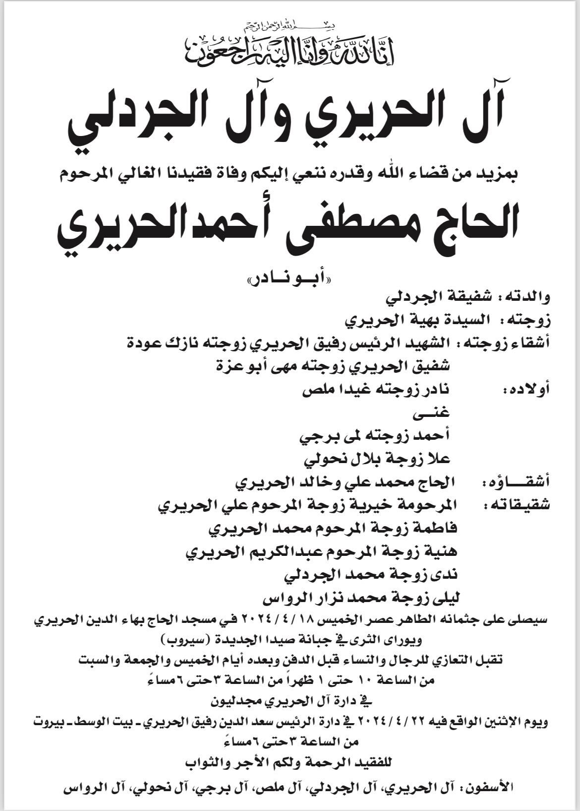 عمون - توفي مصطفى الحريري، زوج النائبة السابقة بهيّة الحريري في البرلمان اللبناني -شقيقة رئيس الوزراء اللبناني الأسبق رفيق الحريري- ، ووالد الأمين العام للتيار "المستقبل" أحمد الحريري ونادر الحريري. |
