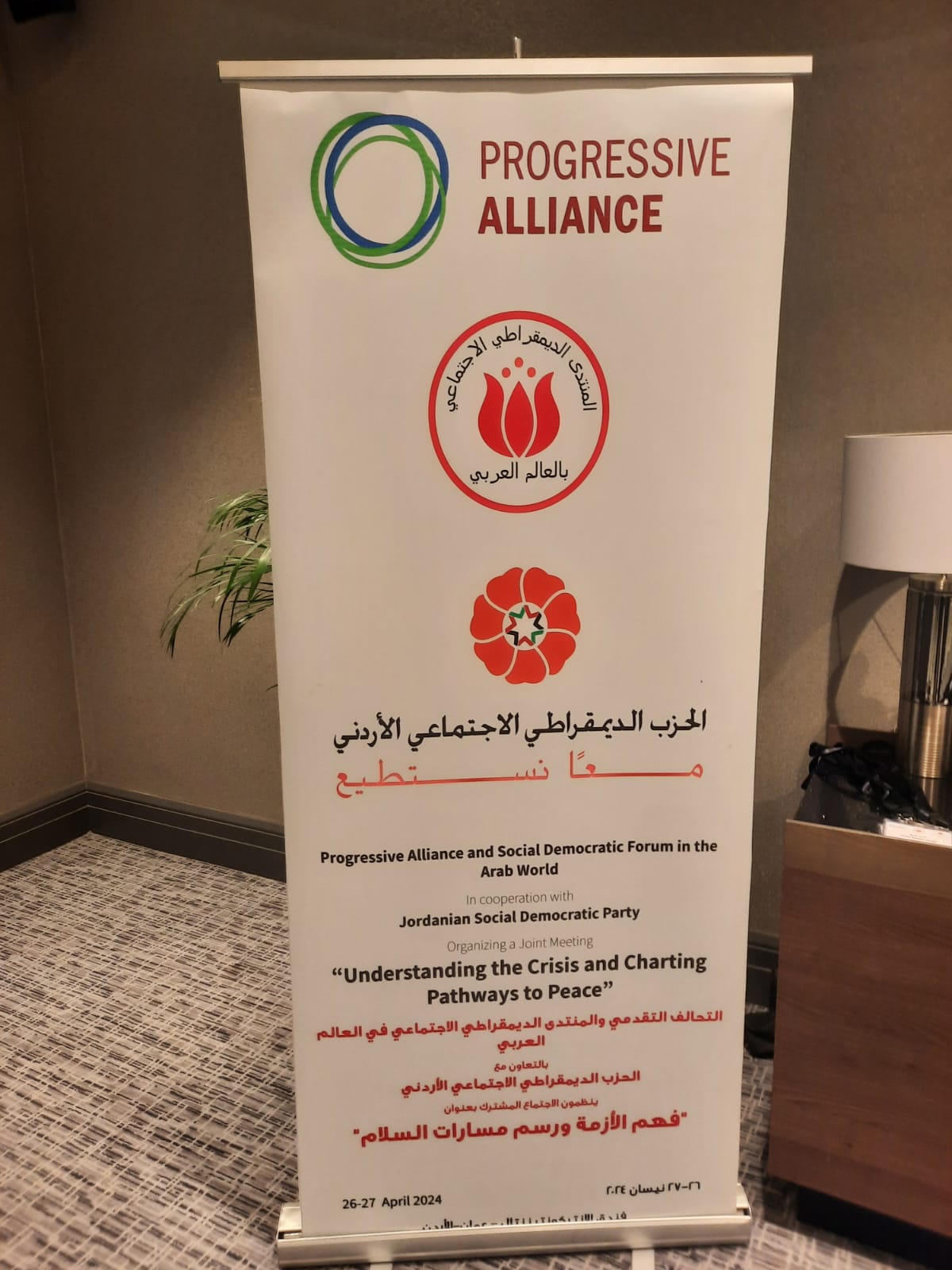 بالتعاون مع التحالف الدولي PA ومنتدى الأحزاب الديموقراطية الاجتماعية في العالم العربي، وتحدث به وزير الخارجية الأردني أيمن الصفدي، بحضور شخصيات سياسية فلسطينية وعربية ودولية معروفة، منهم رؤساء وزراء سابقون ووزراء خارجية سابقين مساندين للقضية الفلسطينية ود. مصطفى البرغوثي ود. مروان المعشر وسفراء الدول الداعمة ايضا، للتوافق على موقف موحد بخصوص القضية الفلسطينية.