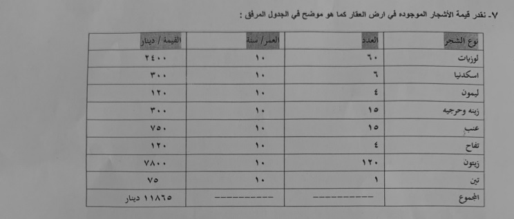 7- تقدر قيمة الاشجار الموجودة في أرض العقار بـ 11865 دينار، وفقا للجدول المرفق في الاسفل.