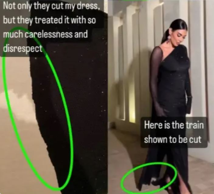 وكتب المصمم في منشور له أن ياسمين طلبت استعارة الفستان من دون دفع ثمنه على أن تروج لاسمه، لكنه اكتشف أن ذيل الفستان تم قصه بدون إذنه، مما جعله يشعر بعدم الاحترام والاحترافية. وأشار إلى أن منسقة الملابس، الخاصة بالممثلة المصرية وتدعى يمنى مصطفى، تواصلت معه وأخبرته أن "ذيل الفستان" طويل للغاية وسوف يتسبب في سقوطها ومن ثم لابدّ من قصه، إلا أنه رفض الفكرة نهائيًا، لأن ذلك سوف يقضي على فكرة التصميم.