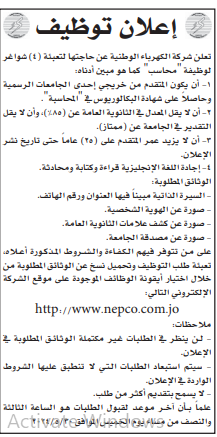 وظائف شاغرة لدى شركة الكهرباء الوطنية