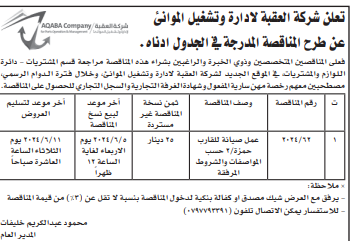عطاء صادر عن شركة العقبة لادارة وتشغيل الموانئ