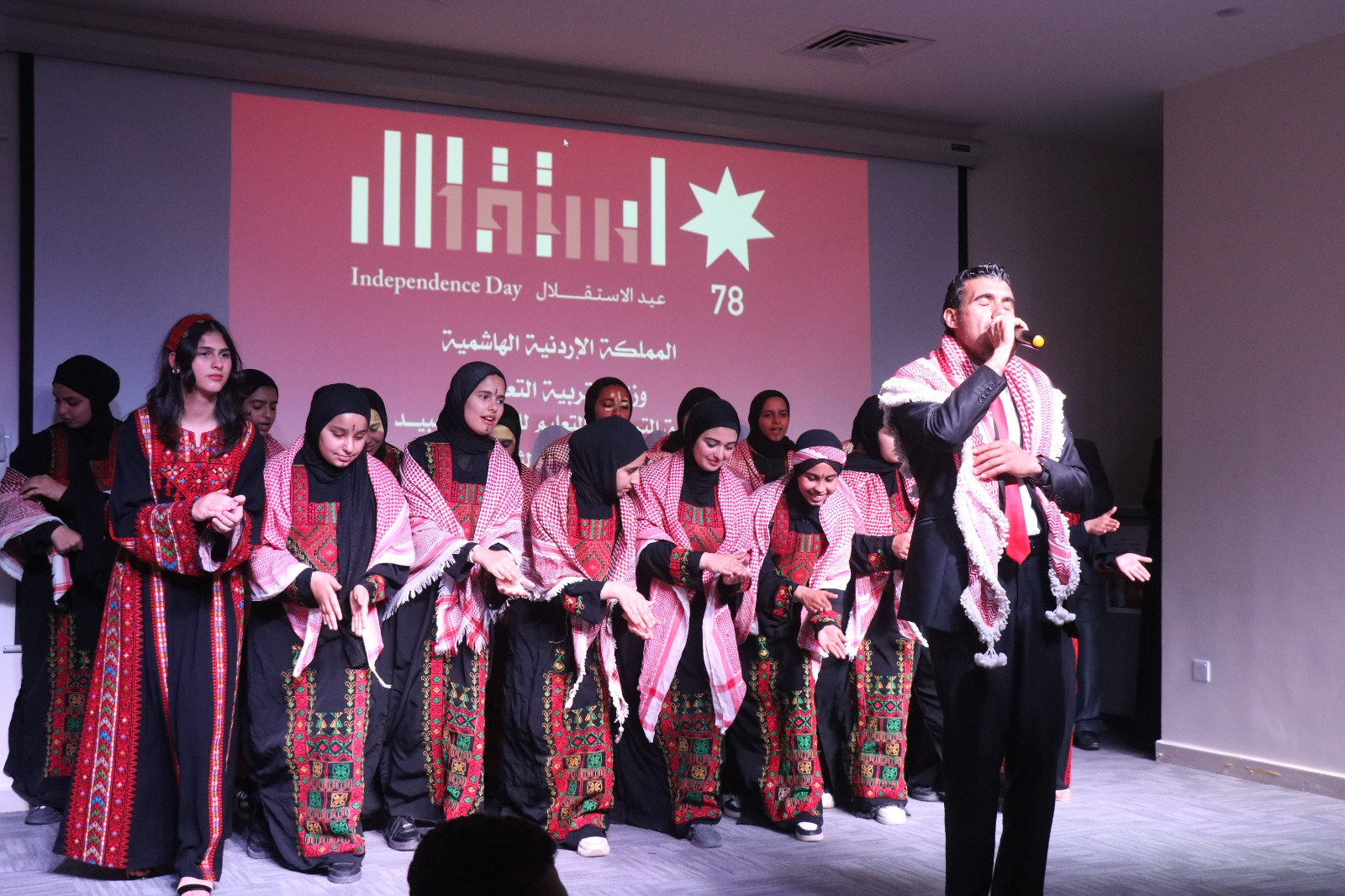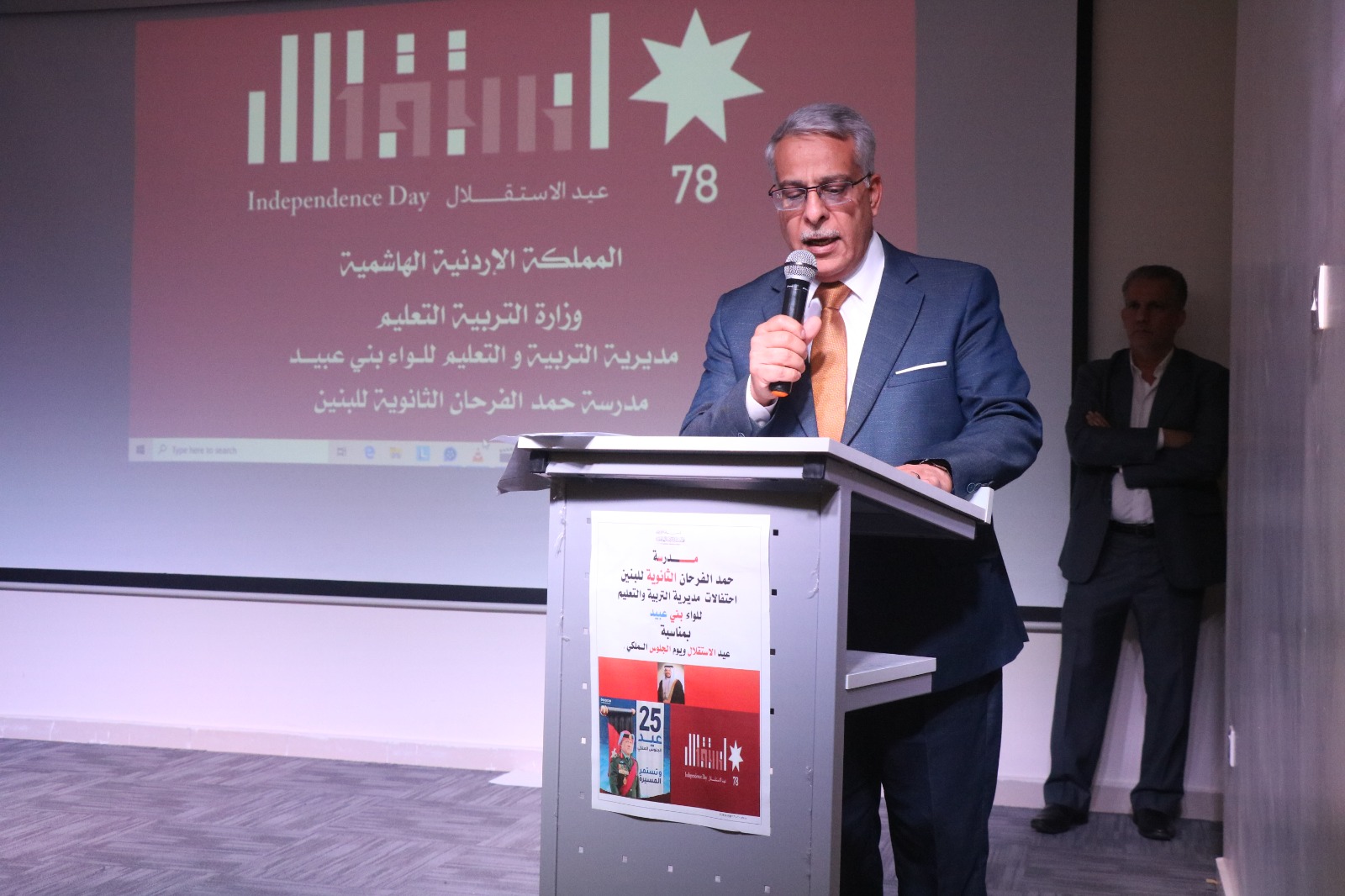 عمون - مندوباً عن مديرة التربية والتعليم للواء بني عبيد الدكتورة فاطمة طلافحة، رعى مدير الشؤون التعليمية الدكتور رعد الخصاونة، احتفال المديرية بعيد الاستقلال الثامن والسبعين، واليوبيل الفضي، الذي نظمه قسم النشاطات التربوية في مدرسة حمد الفرحان الثانوية للبنين.