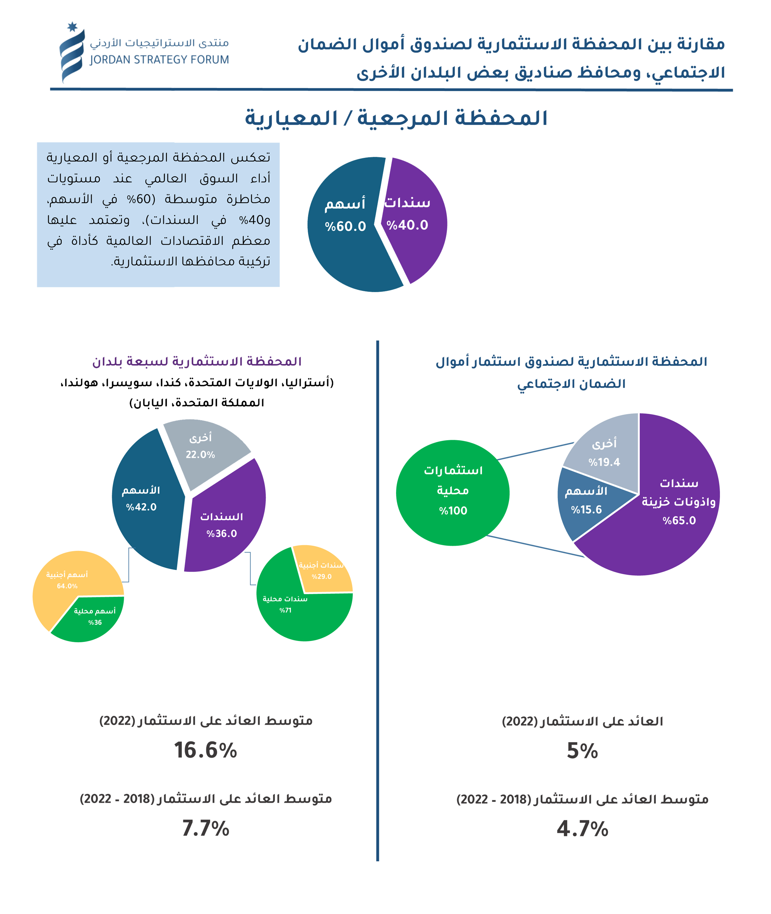 وعند النظر إلى الممارسات العالمية وفق أرقام عام 2022، نجد أن العائد السنوي المتحقق على المحفظة المعيارية (60% أسهم، و40% سندات) يساوي 16.6% لعام واحد فقط. في حين بلغت نسبة معدل العائد السنوي خلال الفترة (2018 - 2022) للمحفظة المعيارية حوالي 7.7%. وتشير هذه النسب إلى أن عوائد المحفظة المعيارية تتجاوز العائد المتحقق لصندوق استثمار أموال الضمان الاجتماعي في الأردن الذي بلغ حوالي 5% في العام 2022، وبالمتوسط خلال الفترة (2018 – 2022).