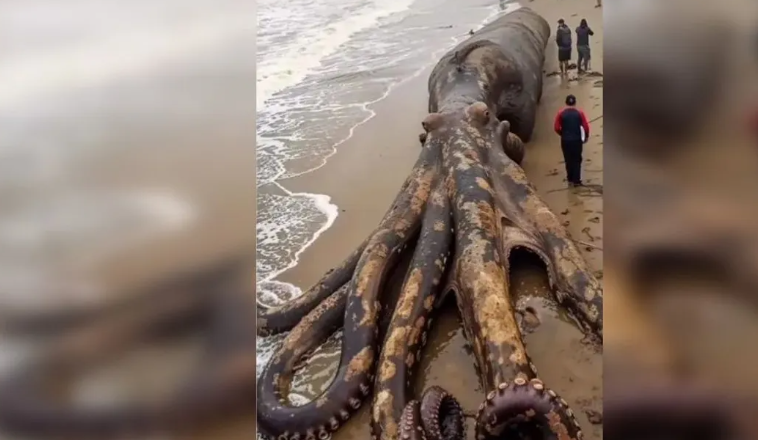 وتظهر الصورة أخطبوطا عملاقا بأطراف طويلة تمتد لعدة أمتار، فيما كان بعض الأشخاص حوله يبدون صغارا، ربما للتحقق منه أو التقاط صور.