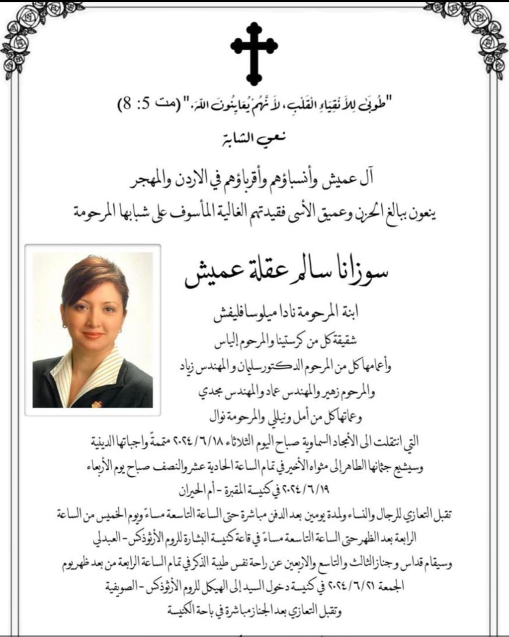 وانتقلت المرحومة سوزانا إلى الأمجاد السماوية صباح اليوم الثلاثاء 18/6/2024 متممة واجباتها الدينية وسيشيع جثمانها الطاهر إلى مثواه الأخير في تمام الساعة الحادية عشر والنصف صباح يوم غدٍ الأربعاء، 19/6/2024 من كنيسة المقبرة (أم الحيران).