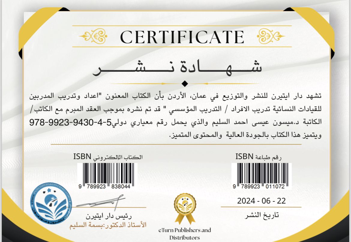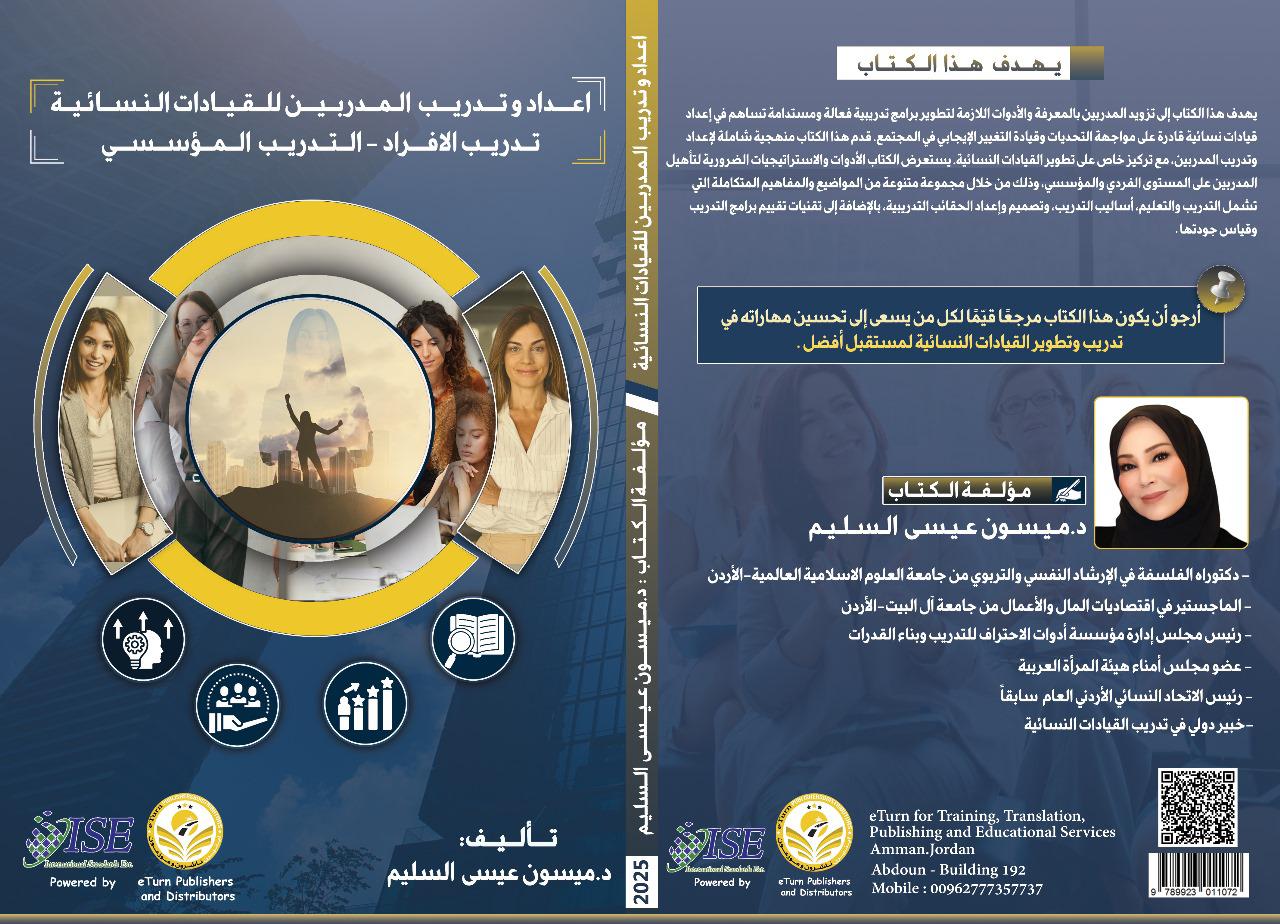 عمون - أعلن المكتب الاعلامي لمؤسسة ادوات الاحتراف للتدريب وبناء القدرات عن إصدار الدكتورة ميسون عيسى السليم، الخبيرة الدولية في تدريب القيادات النسائية ورئيسة مجلس إدارة مؤسسة أدوات الاحتراف للتدريب وبناء القدرات في الأردن، لكتابها الجديد بعنوان "إعداد وتدريب المدربين للقيادات النسائية / تدريب الأفراد - التدريب المؤسسي".