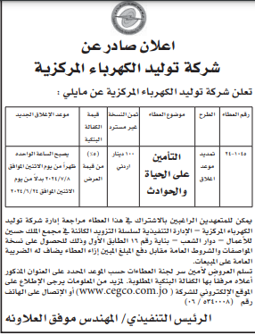 عطاء صادر عن شركة توليد الكهرباء المركزية