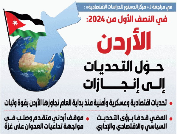 * «مركز الدستور للدراسات الاقتصادية» ومع انتهاء النصف الأول من العام 2024 (يصادف اليوم) يجري مراجعة سريعة وقراءة في أبرز ما واجههه الأردن خلال النصف الأول من هذا العام من تحديات، وكيف استطاع تجاوزها، وما الذي حققه على صعيد رؤى التحديث الاصلاحية «السياسية والاقتصادية والادارية».. في ظل التحديات الجيوسياسية.
