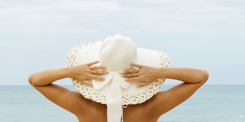 امرأة ترتدي قبعة لحماية شعرها من أشعة الشمس على البحر