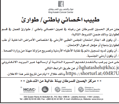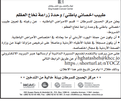 وظائف شاغرة لدى مركز الحسين للسرطان