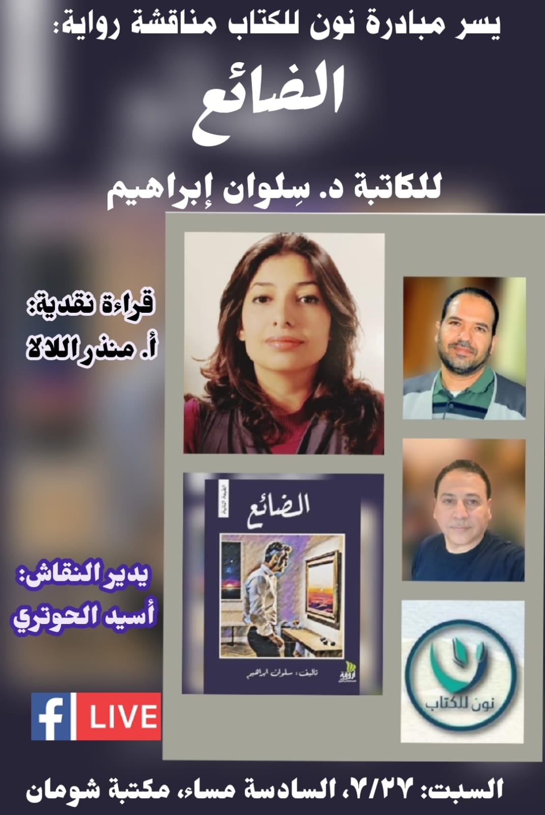 عمون - تعقد مبادرة نون للكتاب جلستها العشرين في مكتبة عبد الحميد شومان، جبل عمّان، يوم السبت الموافق السابع وعشرين من الشهر الجاري، الساعة السادسة والنصف مساء، وذلك لمناقشة رواية "الضائع" للكاتبة د. سلوان أحمد إبراهيم. تقدم القاصة سمر السيد المشاركيين الرئيسيين، كما يقدم السيد منذر اللالا قراءة نقدية للرواية، ويدير المناقشة الناقد أسيد الحوتري. يتخلل الفعالية ثلاث فواصل شعرية قصيرة تقدمها الشاعرة وداد أبو شنب.