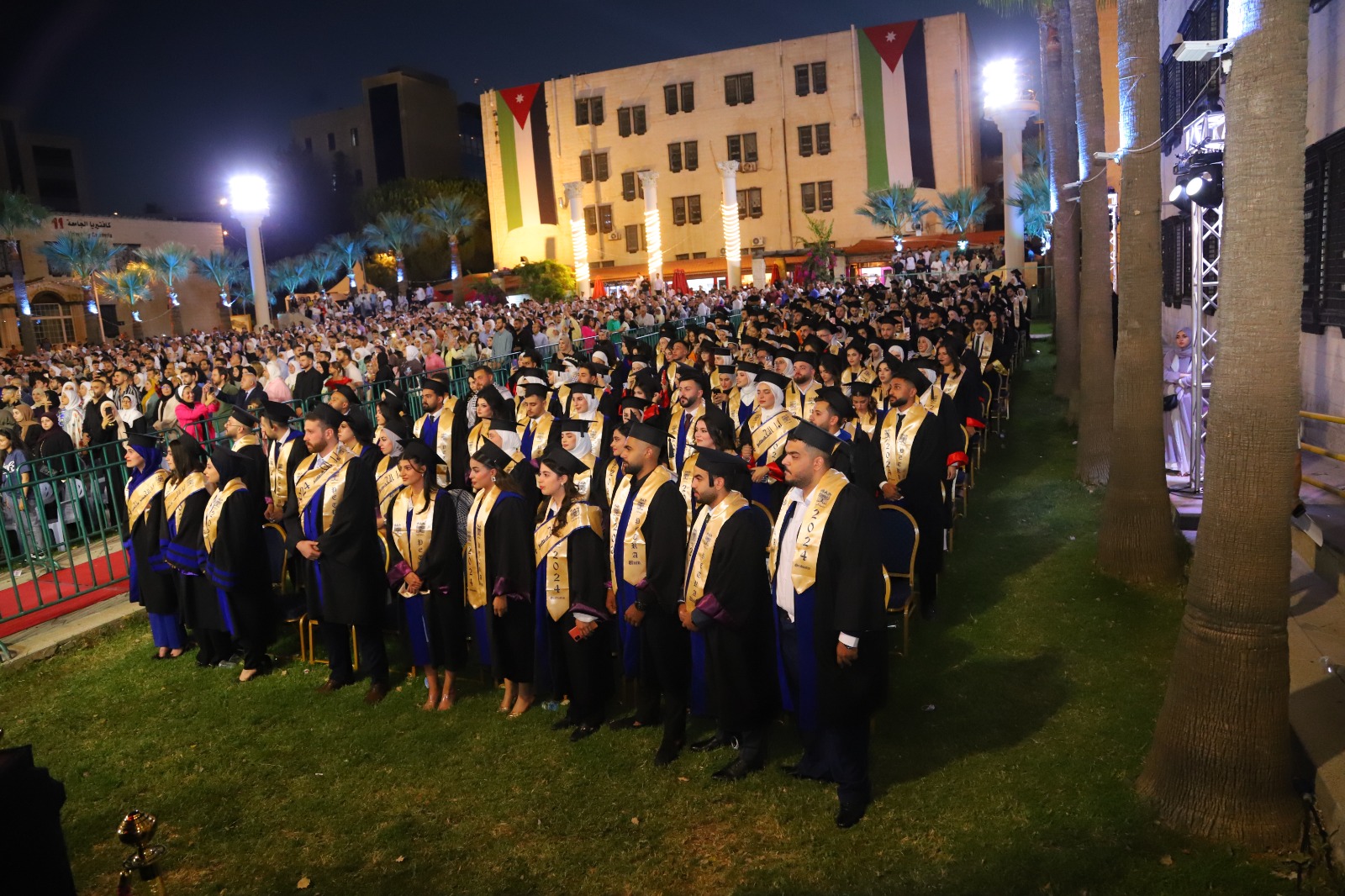 وألقى الطالب الحارث بني فواز كلمة الخريجين قائلاً: "إنه لشرف عظيم أن أقف اليوم بين أيديكم أصالة عن نفسي ونيابة عن زملائي الخريجين. لقد حرصت جامعتنا على الدوام أن تكون مع طلابها لتوصلهم إلى هذه المرحلة، وتأخذ بأيديهم إلى النجاح والفلاح".
