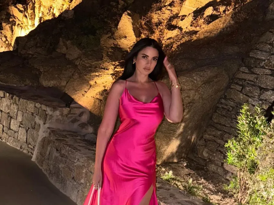 في إطلالة جذابة وأنيقة، تألقت درة زروق بفستان سهرة فوشيا يتسم بالنعومة والرقة، بقماش الساتان وبقصة بسيطة مع حمالات رفيعة وشق أمامي طويل، ونسَّقت معه حقيبة باللون الأبيض وحذاءً شفافاً.