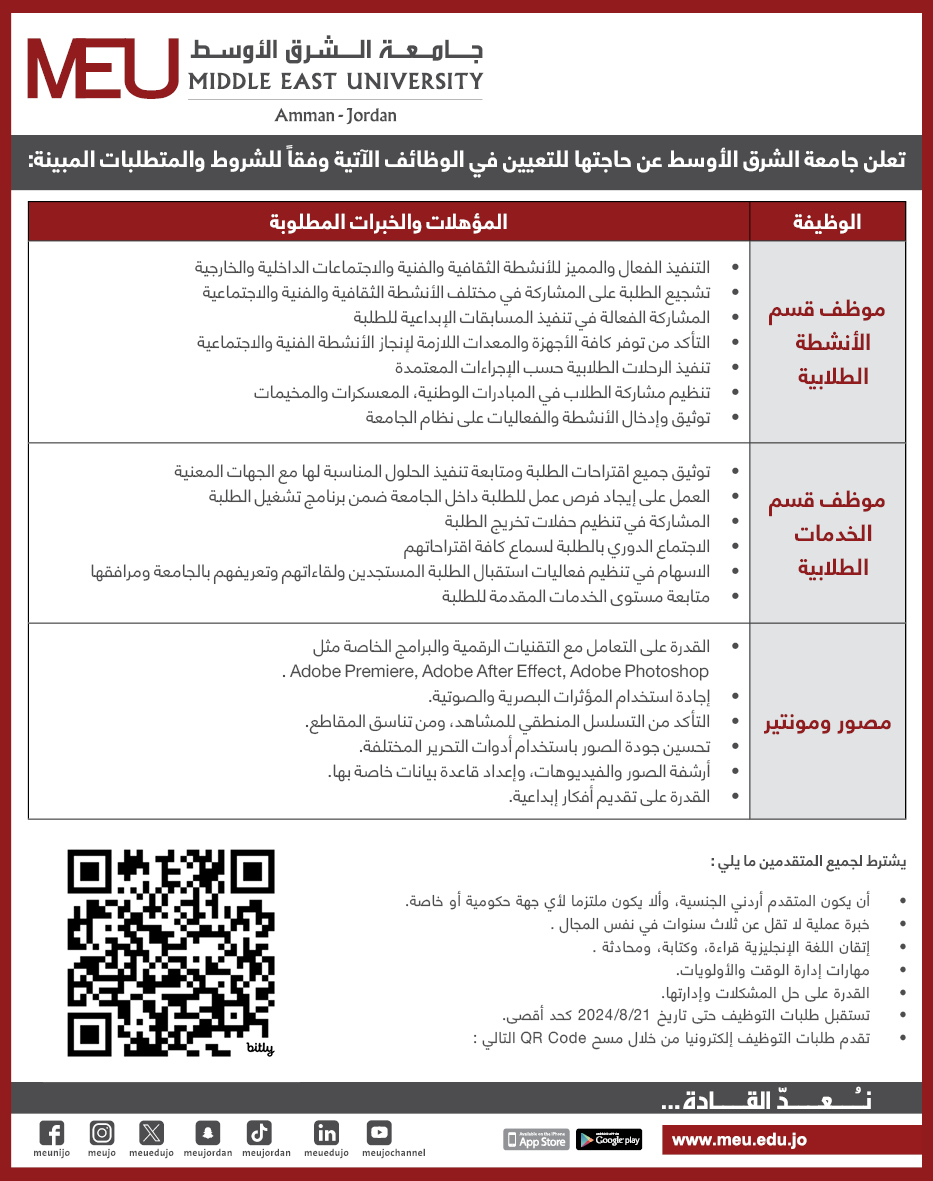 وظائف شاغرة لدى جامعة الشرق الاوسط