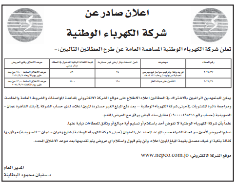 عطاءات صادرة عن شركة الكهرباء الوطنية