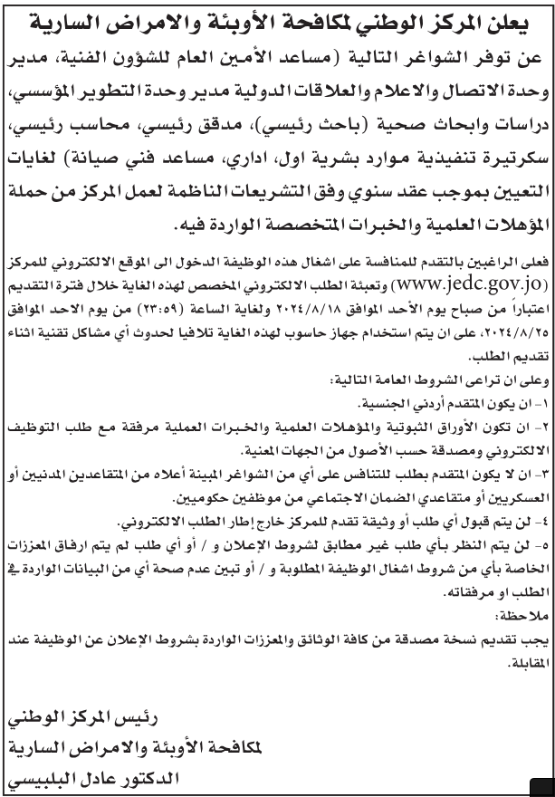 وظائف شاغرة لدى المركز الوطني لمكافحة الاوبئة والامراض السارية