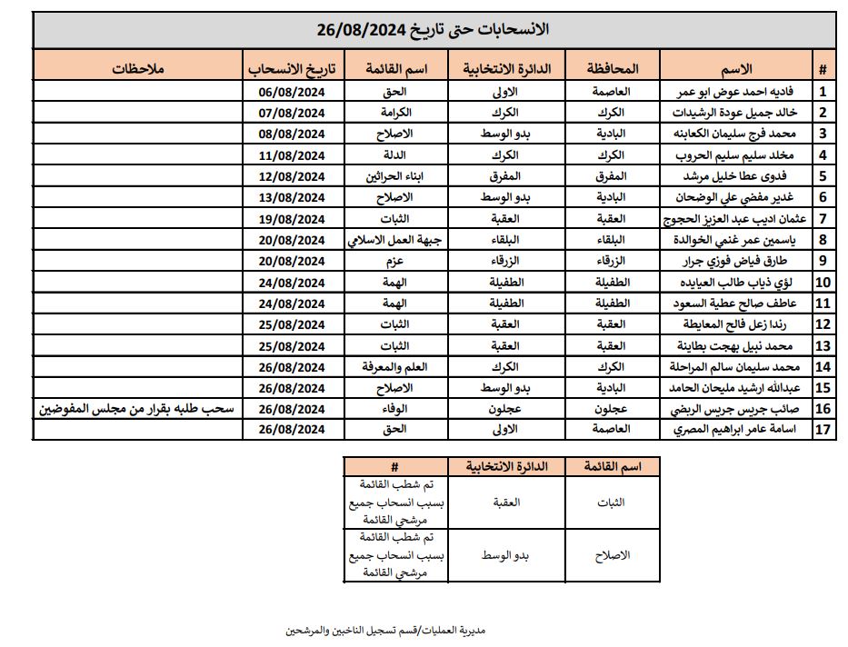 وأفادت الهيئة في بيانها بأن عدد المرشحين الذين قرروا الانسحاب من السباق الانتخابي بلغ 17 مرشحًا. في حين ستُنشر القوائم النهائية للمرشحين عن الدوائر المحلية يوم الأربعاء المقبل.