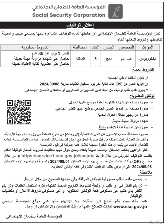 وظيفة شاغرة لدى المؤسسة العامة للضمان الاجتماعي