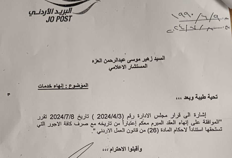 سابعا : ارفق لكل وسائل الاعلام التي نشرت ما كتبه الدكتور موسى الصبيحي كتاب المخاطبة من قبل المدير العام بالوكالة للشركة والموجه لوزارة العمل بتاريخ 21 / 7 / 2024، والذي يؤكد انني كنت موظفا في الشركة حيث كنت احصل على اجازات سنوية اسوة بكل موظف في الشركة وفقا للعقد المبرم معي استنادا لاحكام نظام موظفي شركة البريد الاردني والنظام الداخلي لموظفيها والنظام الاساسي لشركة البريد، وقد حصلت على كل الاجازات التي استحقها كموظف على راس عمله بشكل يومي، كما حصلت بعد انهاء العقد بتاريخ 8 / 7 / 2024 على بدل مالي مقابل عدم حصولي على اجازات اخر عامين اي 2023 و2024، وكما هو معلوم لا يمكن لصاحب عقد غير موظف ان يستحق اجازات او ان يتقاضى أية اموال عن الاجازات كما هو حال الموظف، فكيف تقول الاستشارة القانونية أنني لم اكن موظفا؟