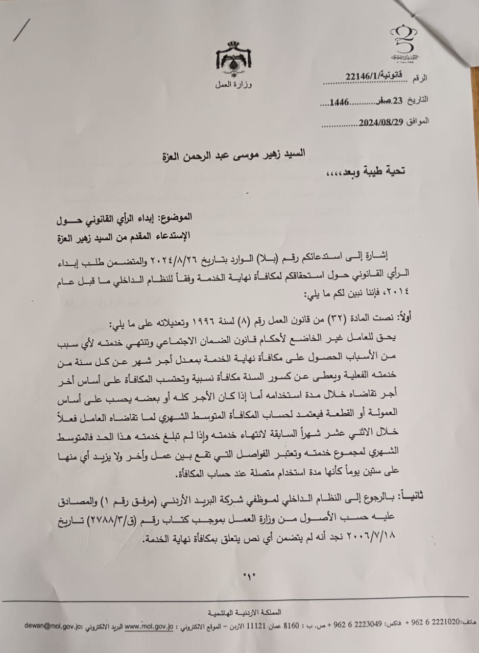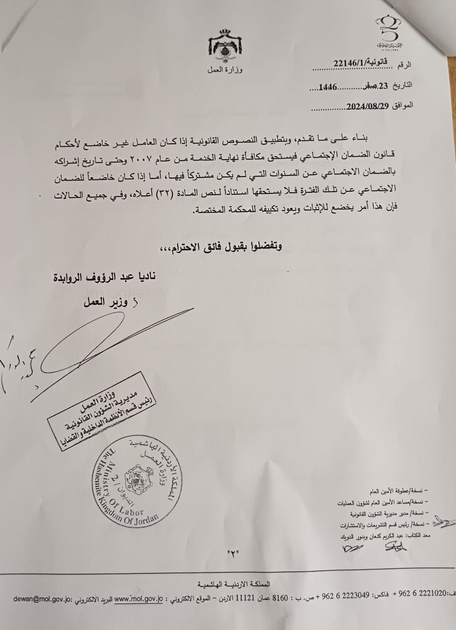 رابعا: وازاء ذلك اضطررت أن اتوجه لوزارة العمل طالبا الرأي القانوني، وبعد ايام قامت وزارة العمل مشكورة بالرد على مناشدتي المتعلقة بضرورة الحصول على رد حول "هل استحق مكافأة نهاية خدمة عن الفترة الممتدة من تاريخ 24 / 7/ 2020 وحتى 8/ 7/ 2024 ام لا وهي الفترة التي لم اخضع خلالها لقانون الضمان الاجتماعي، لكوني أحلت إلى التقاعد واحصل على راتب تقاعدي من الضمان، وقد جاء رد وزارة العمل بانني استحق الحصول على مكافأة نهاية خدمة عن سنوات العمل التي لم اخضع بها لقانون الضمان "اي لايوجد اقتطاع لصالح الضمان" (مرفق صورة عن الاستدعاء وعن رد وزارة العمل).