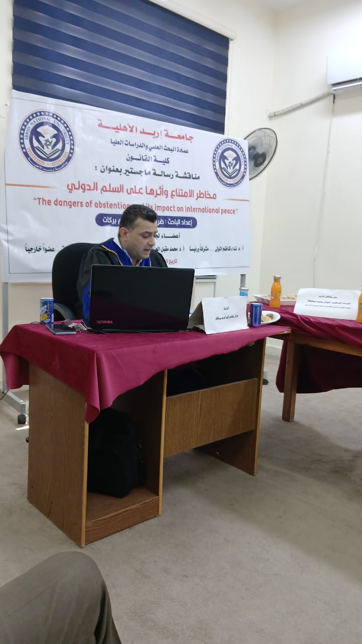 عمون - تتقدم رابطة الأدباء والمثقفين العرب، الذراع الثقافي لمؤسسة أدوات الاحتراف للتدريب وبناء القدرات، ممثلة برئيستها الدكتورة ميسون تليلان السليم، بخالص التهاني والتبريكات للأستاذ ضرار مفضي إبراهيم بركات، عضو الرابطة ورئيس اللجنة القانونية فيها، بمناسبة مناقشته الناجحة لرسالة الماجستير التي حملت عنوان "مخاطر الامتناع وأثره على السلم الدولي"، والتي تمت في كلية القانون تحت إشراف الأستاذة الدكتورة نداء المولى، وبمشاركة لجنة المناقشة الموقرة المكونة من الدكتور محمد العندلي والأستاذ الدكتور عمران محافظة. |